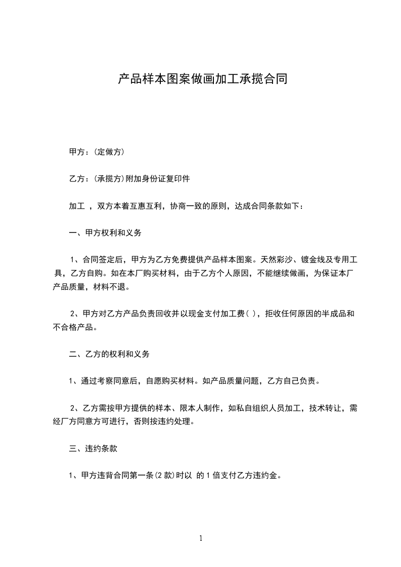 1、合同签定后,甲方为乙方免费提供产品样本图案。天然彩沙、镀金线及专用工具,乙方自购。如在本厂购买材料,由于乙方个人原因,不能继续做画,为保证本厂产品质量,材料不退。