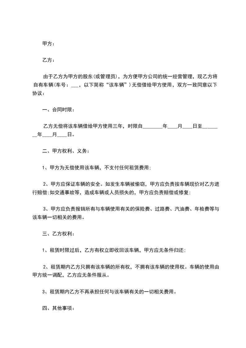 由于乙方为甲方的股东(或管理员),为方便甲方公司的统一经营管理,现乙方将自有车辆(车号:___,以下简称“该车辆”)无偿借给甲方使用,双方一致同意以下协议:
