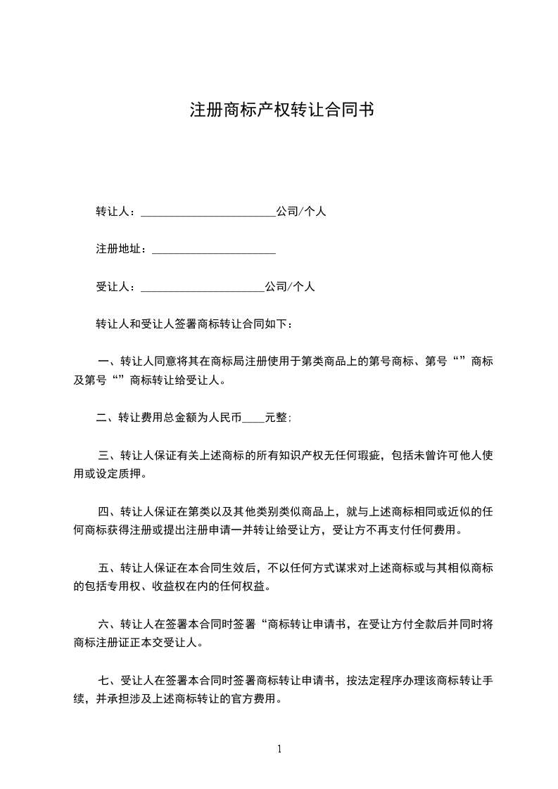 六、转让人在签署本合同时签署“商标转让申请书,在受让方付全款后并同时将商标注册证正本交受让人。