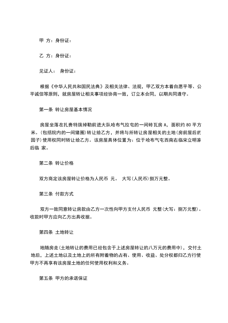 房屋坐落在扎赉特旗绰勒前进大队哈布气拉屯的一间砖瓦房A,面积约80平方米。(包括院内的一间猪圈)转让给乙方,并将与所转让房屋相关的土地(房前屋后的园子)使用权同时转让给乙方。该房屋具体位置为:位于哈布气屯西南右临宋立明家后临 家。