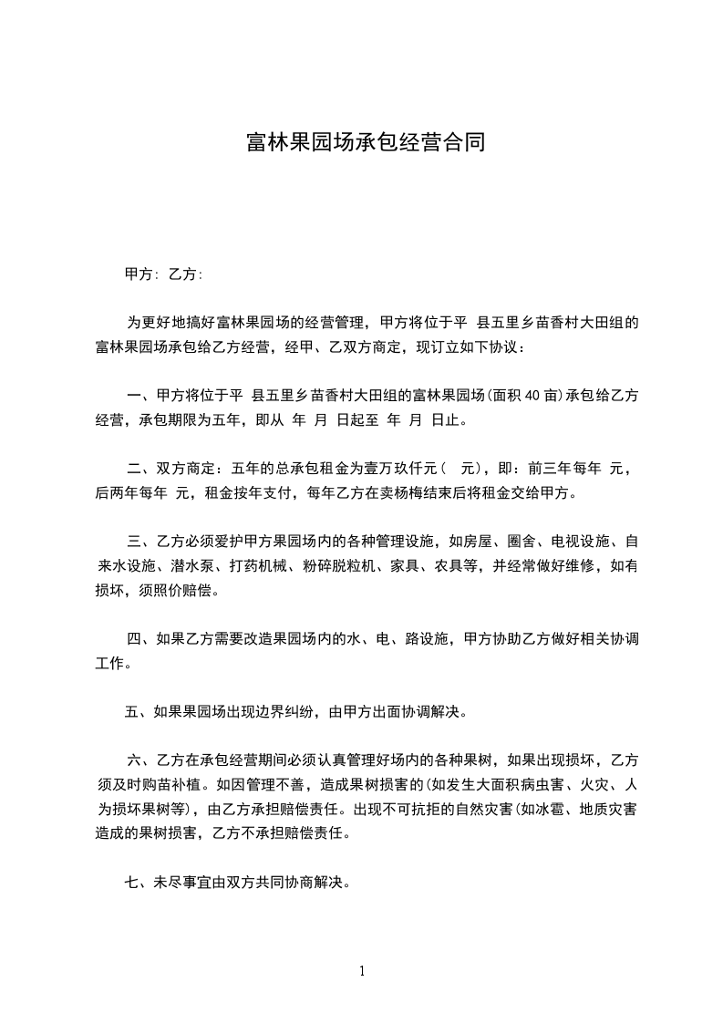 一、甲方将位于平 县五里乡苗香村大田组的富林果园场(面积40亩)承包给乙方经营,承包期限为五年,即从 年 月 日起至 年 月 日止。