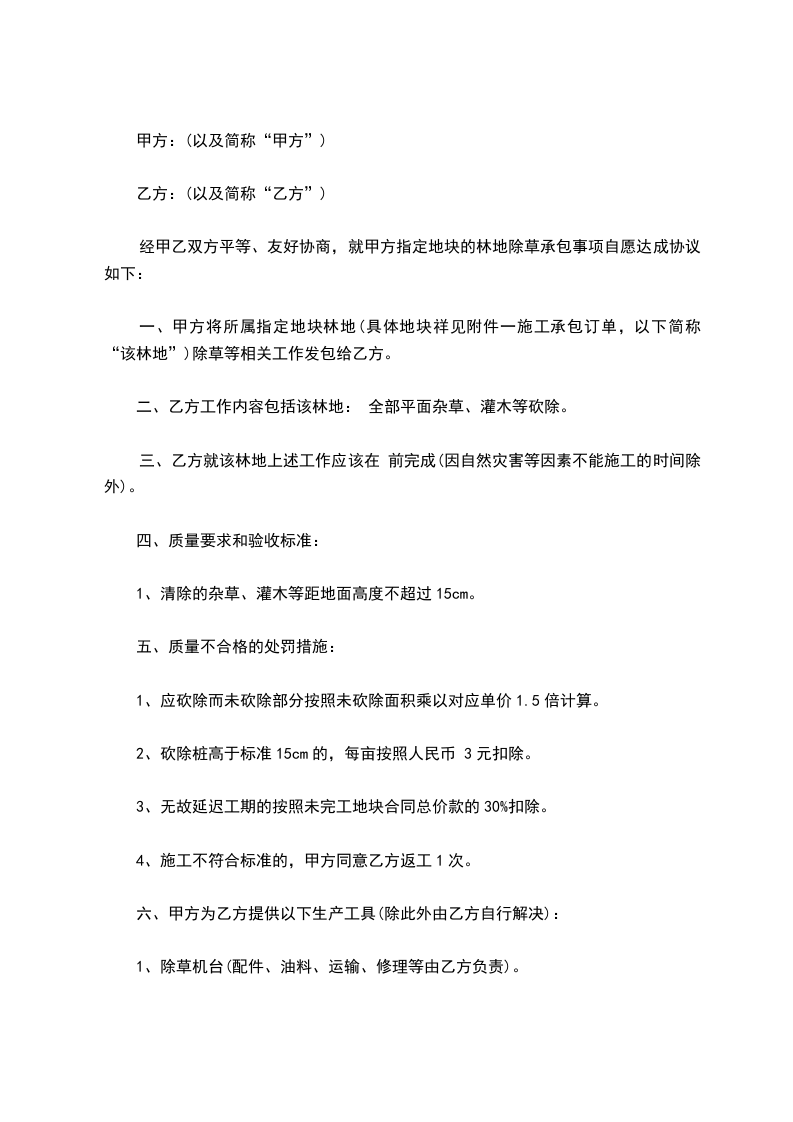 一、甲方将所属指定地块林地(具体地块祥见附件一施工承包订单,以下简称“该林地”)除草等相关工作发包给乙方。