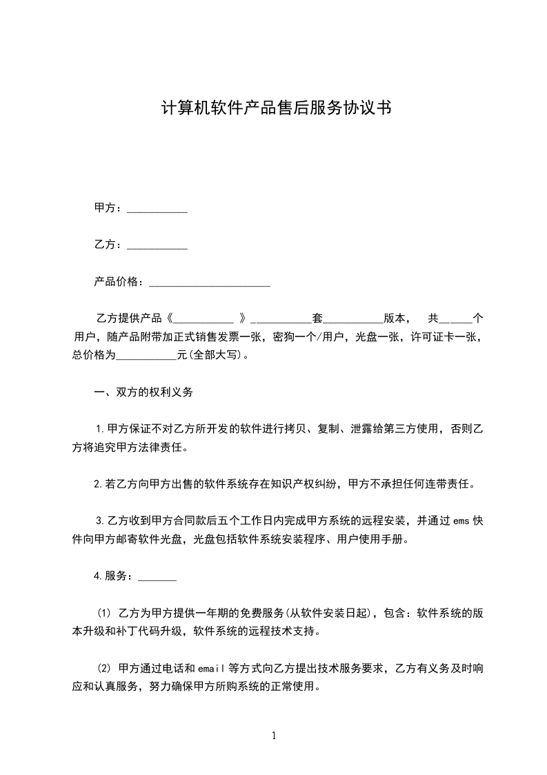 为了加强企业管理、提高经济效益,甲方已经购买了_____________公司开发生产的企业管理软件______产品(以下简称______软件),为了保证软件的正常使用和各方的合法权益,甲方指定乙方为甲方的______软件服务商。经甲乙双方友好协商,就______软件的售后服务达成如下协议: