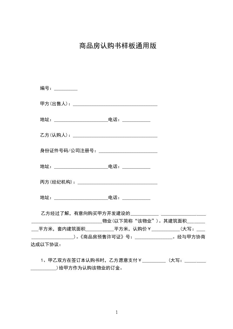 乙方经过了解,有意向购买甲方开发建设的____________ _________________________________________________物业(以下简称“该物业”)。其建筑面积___________平方米,套内建筑面积____________平方米,认购价¥____________(大写:______________________)。《商品房预售许可证》号:________________。经与甲方协商,达成以下协议: