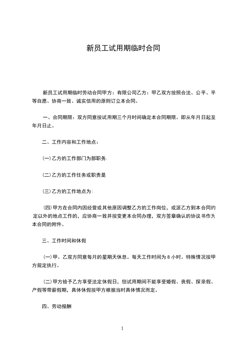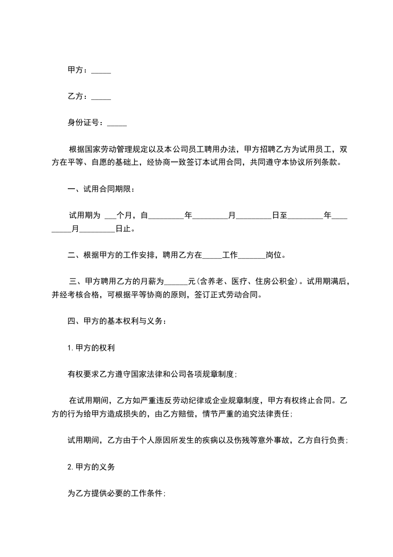 根据国家劳动管理规定以及本公司员工聘用办法,甲方招聘乙方为试用员工,双方在平等、自愿的基础上,经协商一致签订本试用合同,共同遵守本协议所列条款。