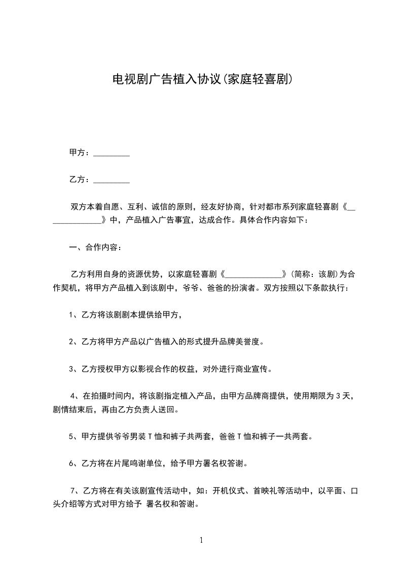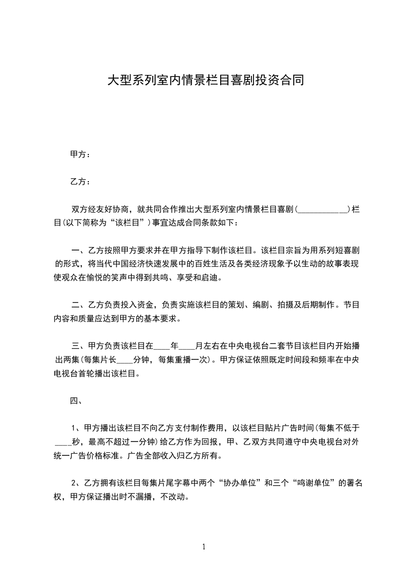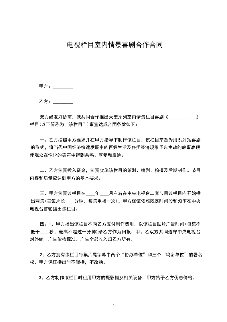 双方经友好协商,就共同合作推出大型系列室内情景栏目喜剧(____________)栏目(以下简称为“该栏目”)事宜达成合同条款如下: