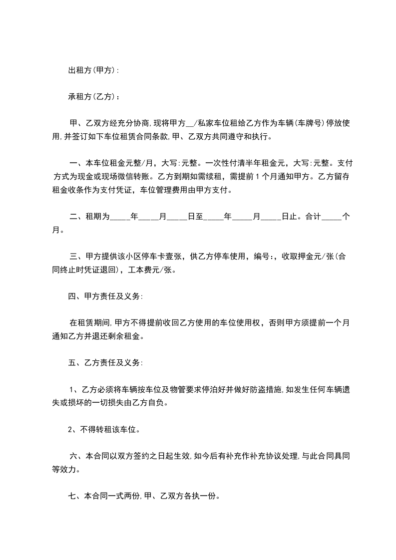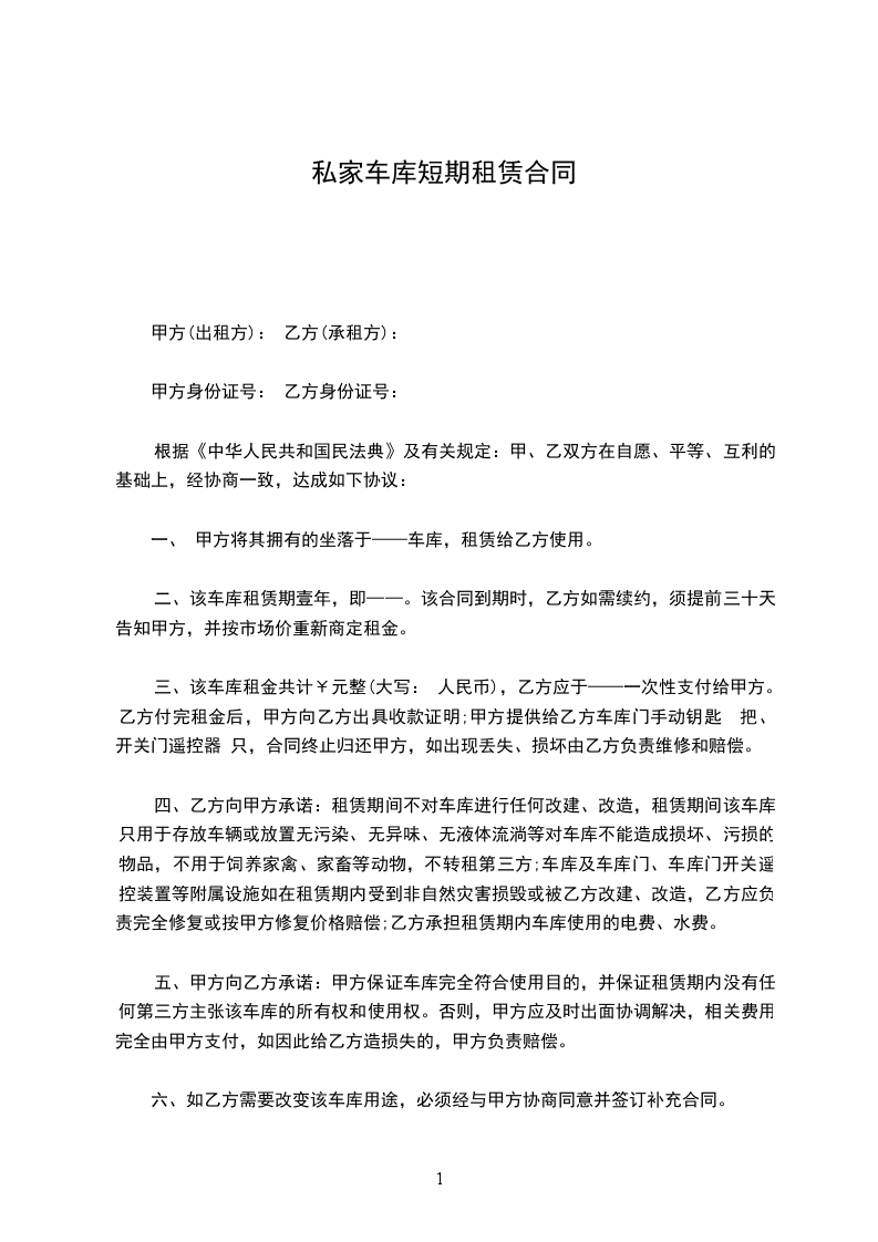 二、该车库租赁期壹年,即——。该合同到期时,乙方如需续约,须提前三十天告知甲方,并按市场价重新商定租金。