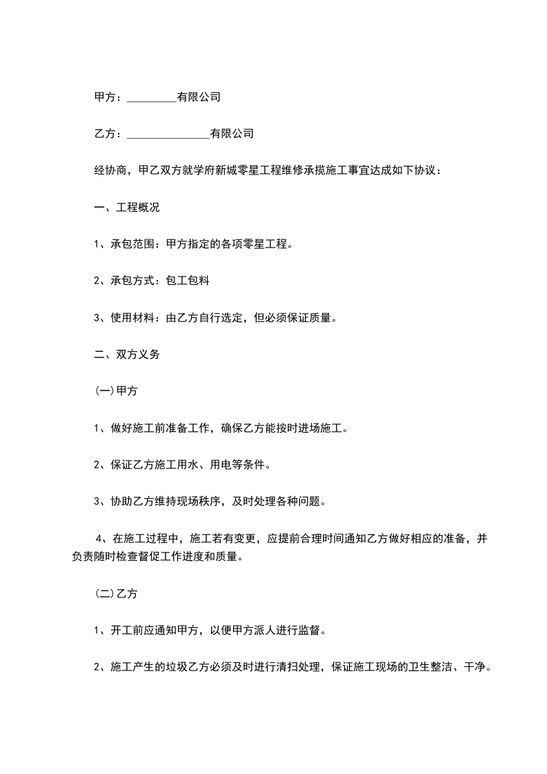 1、承包范围:甲方指定的各项零星工程。