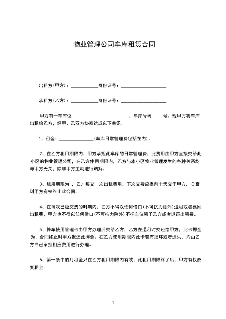 5、停车使用管理卡由甲方办理后交给乙方,乙方在退租时交还给甲方,此卡押金为,合同终止时甲方退还此押金。在乙方使用期限内此卡若有损坏或者遗失,均由乙方自己承担相应费用进行办理。