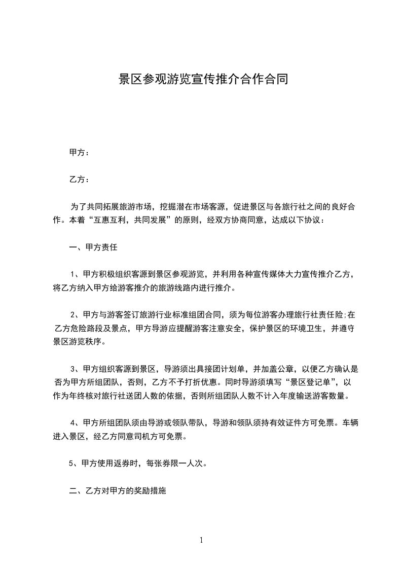 为了共同拓展旅游市场,挖掘潜在市场客源,促进景区与各旅行社之间的良好合作。本着“互惠互利,共同发展”的原则,经双方协商同意,达成以下协议: