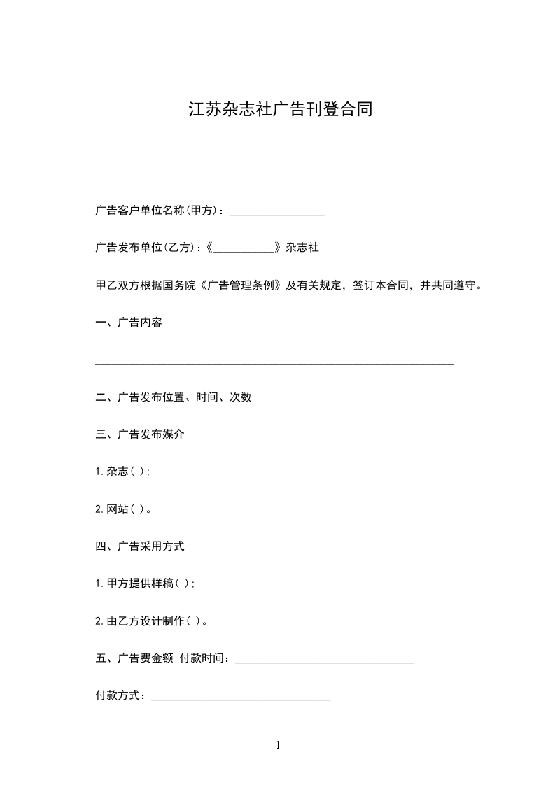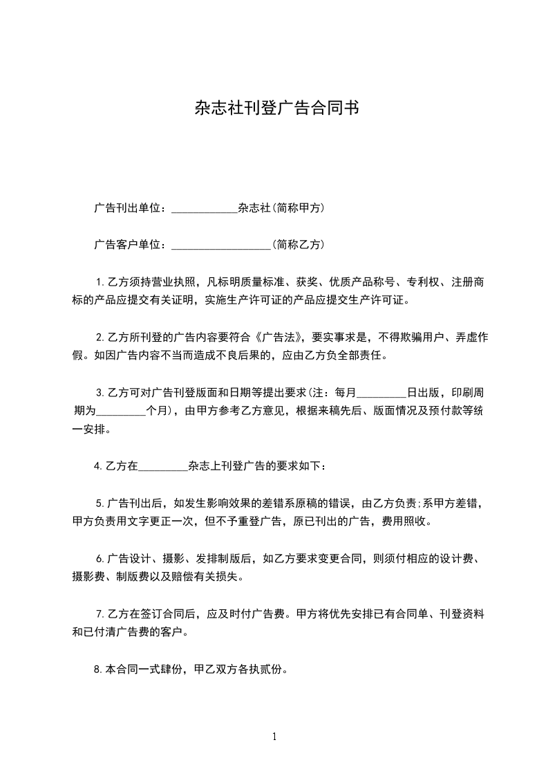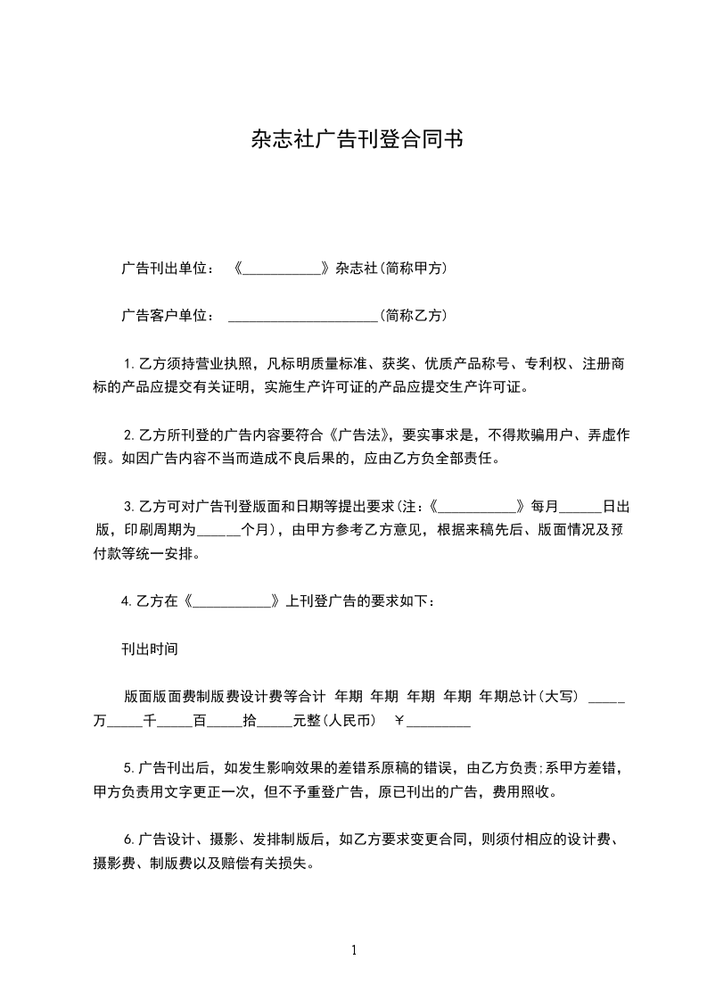 广告刊出单位:____________杂志社(简称甲方)