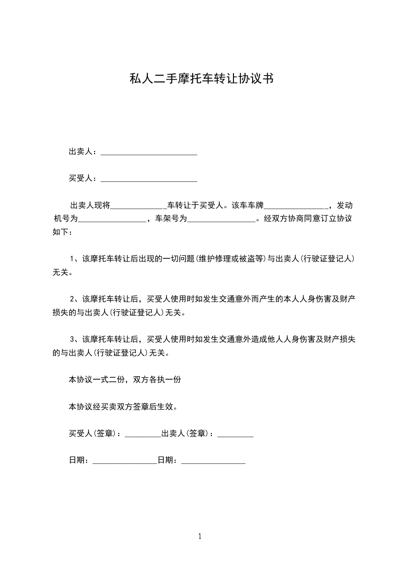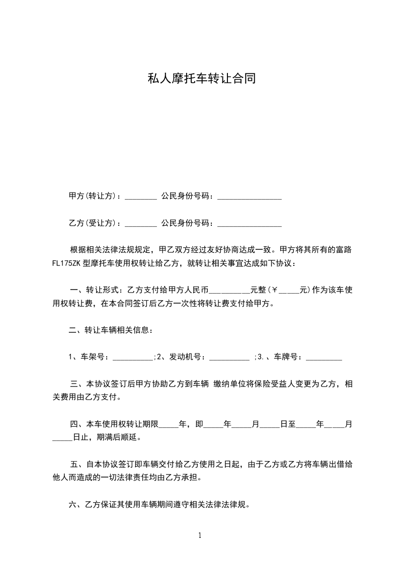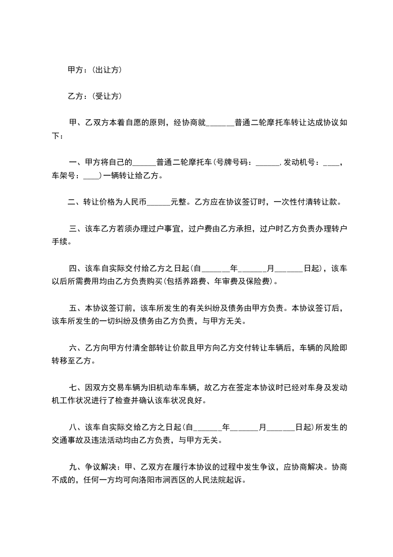 1、甲方将( )普通二轮摩托车转让给乙方,该车车牌号为:( ),出厂日期( ),上牌日期( ),车辆型号( ),车辆识别代号/车架号( ),发动机型号( ),发动机号( ) 转让给乙方,双方达成成交总额为( )。