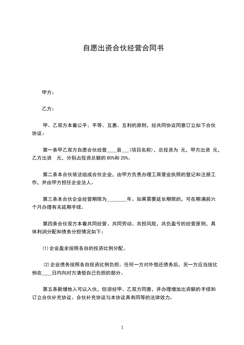 第一条甲乙双方自愿合伙经营____县___(项目名称),总投资为 元,甲方出资 元,乙方出资 元,分别占投资总额的80%和20%。