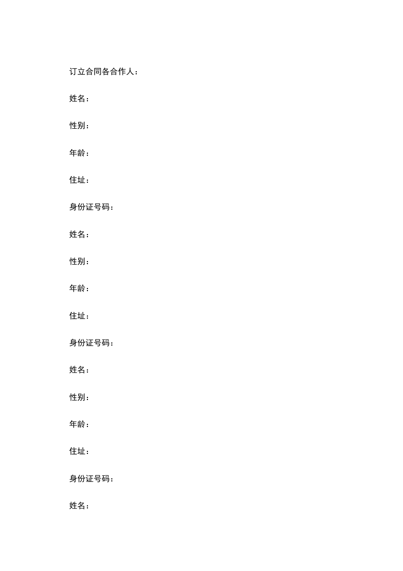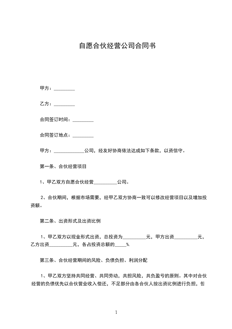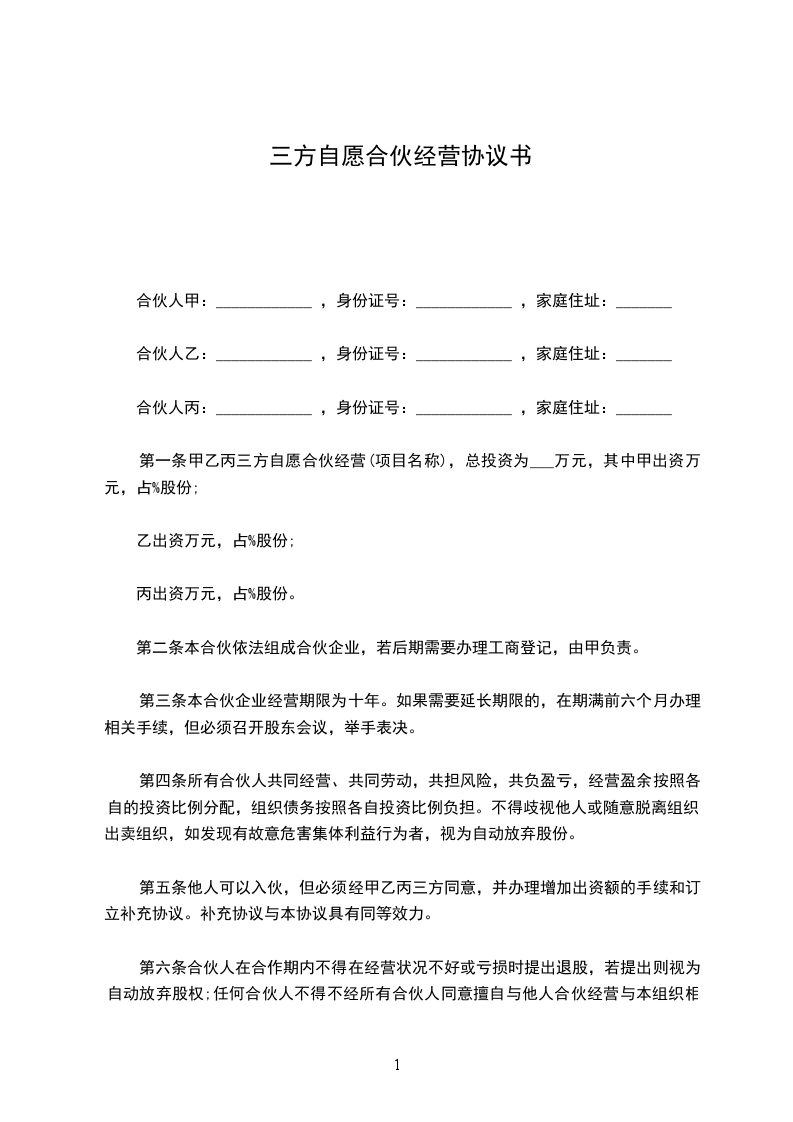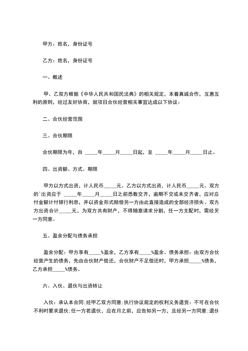 甲、乙双方本着公平、平等、互惠、互利的原则,经共同协议同意订立如下合伙协议: