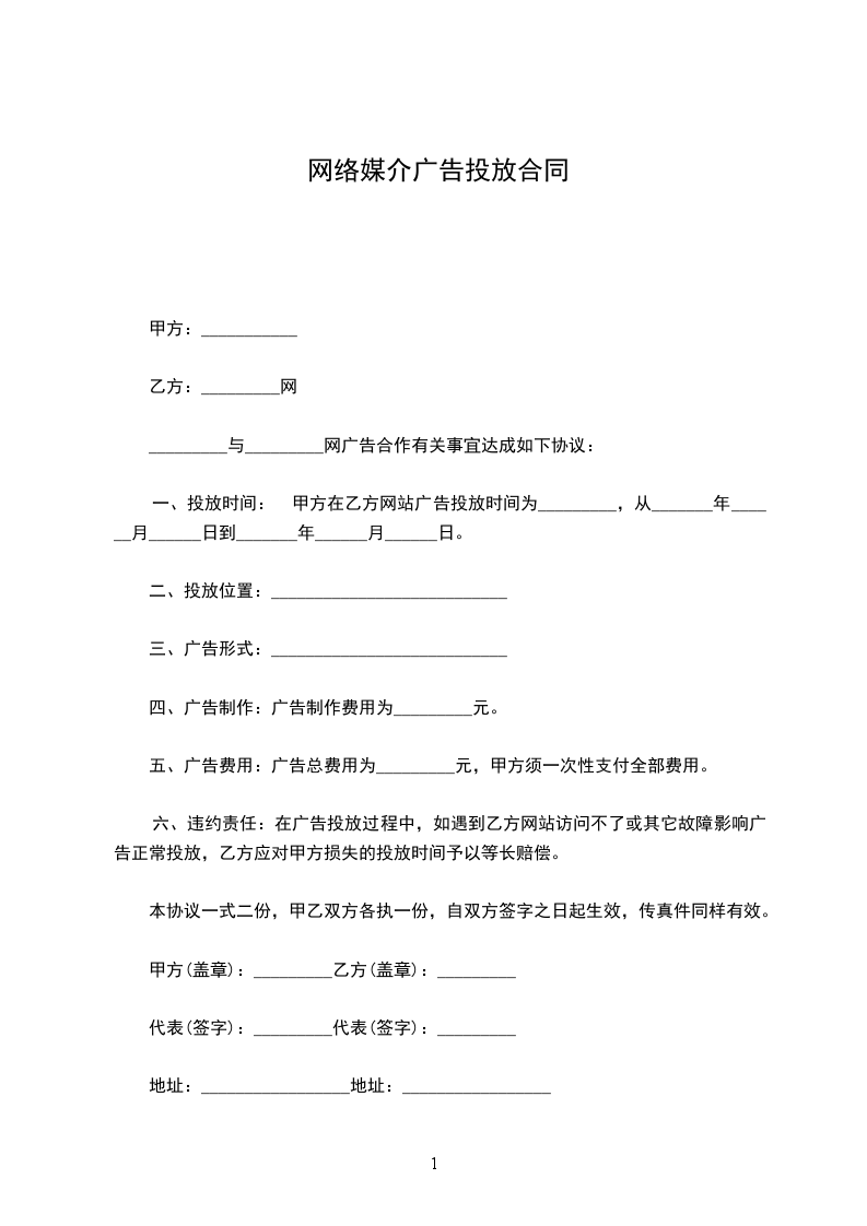 一、投放时间: 甲方在乙方网站广告投放时间为_________,从_______年______月______日到_______年______月______日。