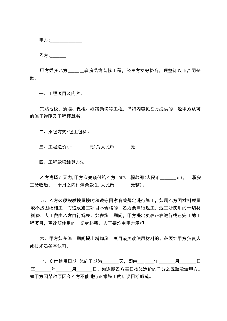 甲方委托乙方_______套房装饰装修工程,经双方友好协商,现签订以下合同条款: