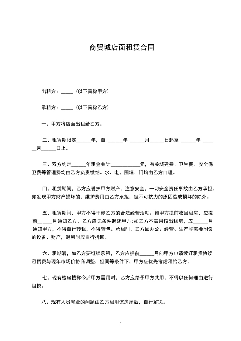 一、甲方将店面出租给乙方。