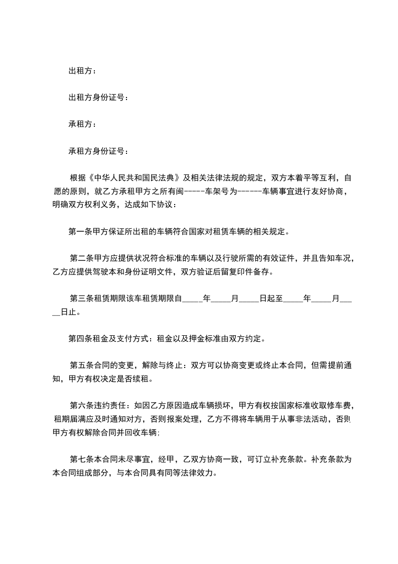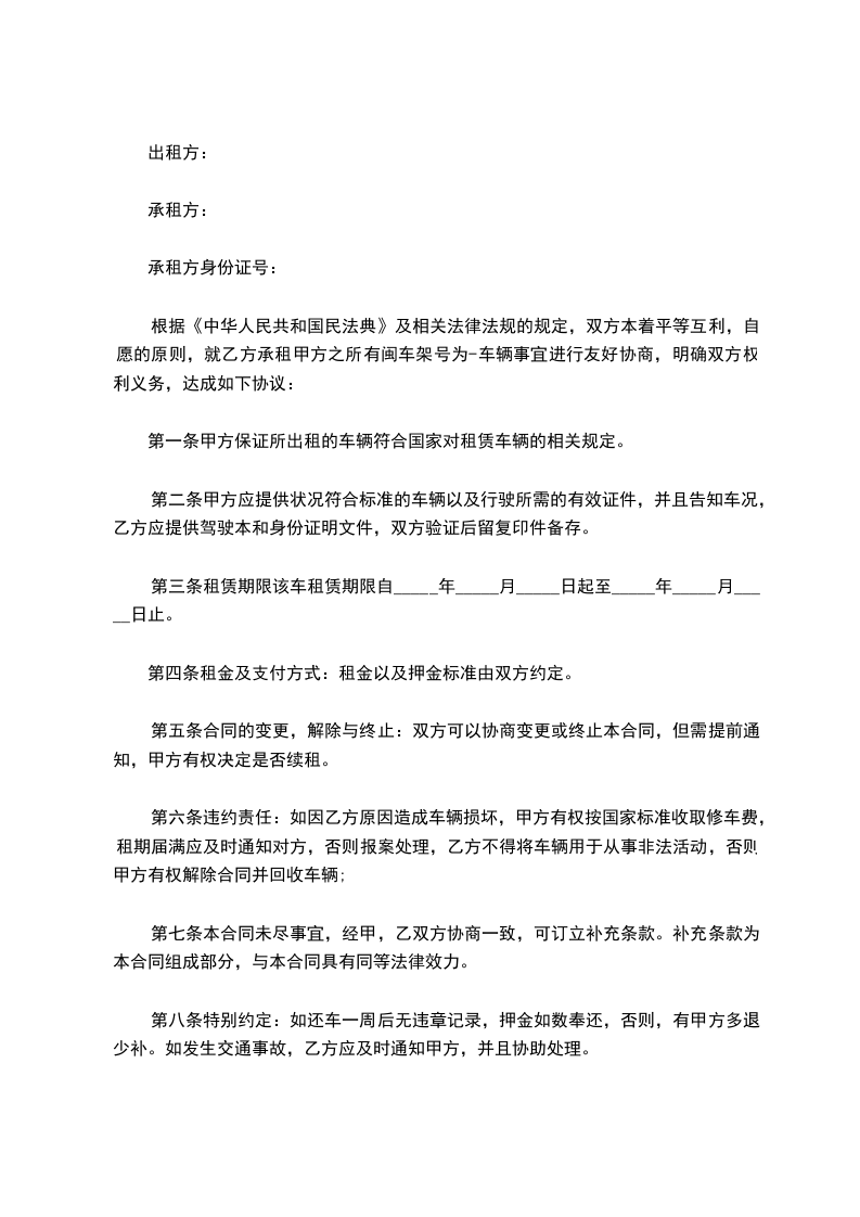 根据《中华人民共和国民法典》及相关法律法规的规定,双方本着平等互利,自愿的原则,就乙方承租甲方之所有闽——车架号为——车辆事宜进行友好协商,明确双方权利义务,达成如下协议: