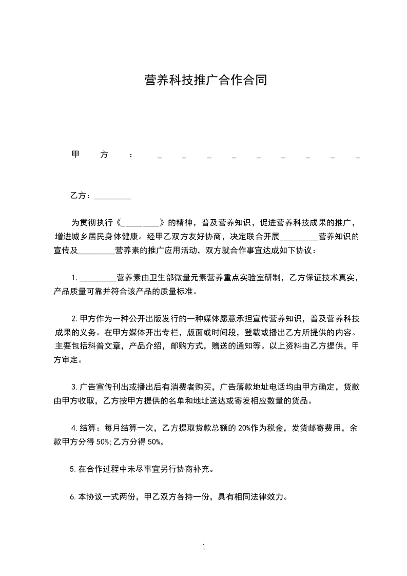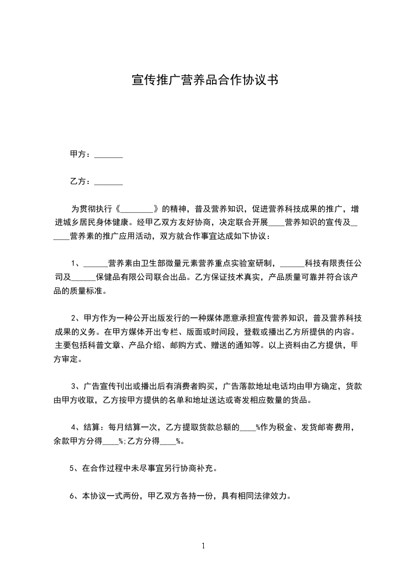 为贯彻执行《________》的精神,普及营养知识,促进营养科技成果的推广,增进城乡居民身体健康。经甲乙双方友好协商,决定联合开展____营养知识的宣传及______营养素的推广应用活动,双方就合作事宜达成如下协议: