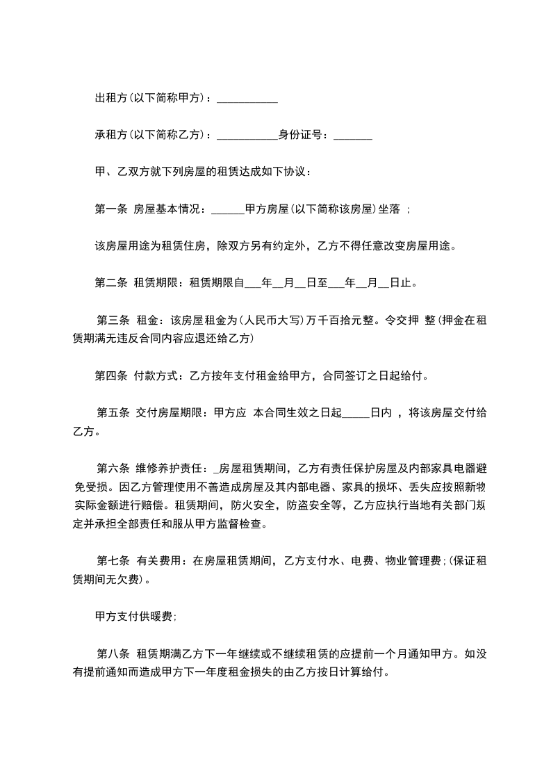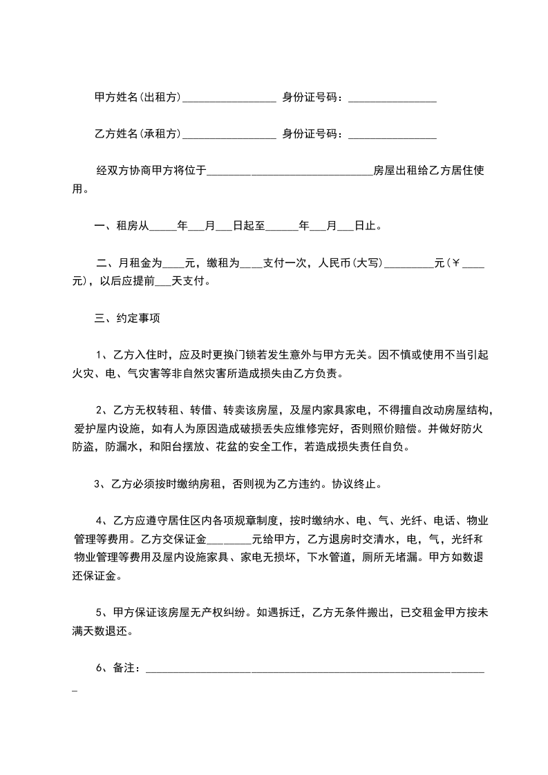 承租方:_________ 身份证号码:_________ ( 以下简称乙方)