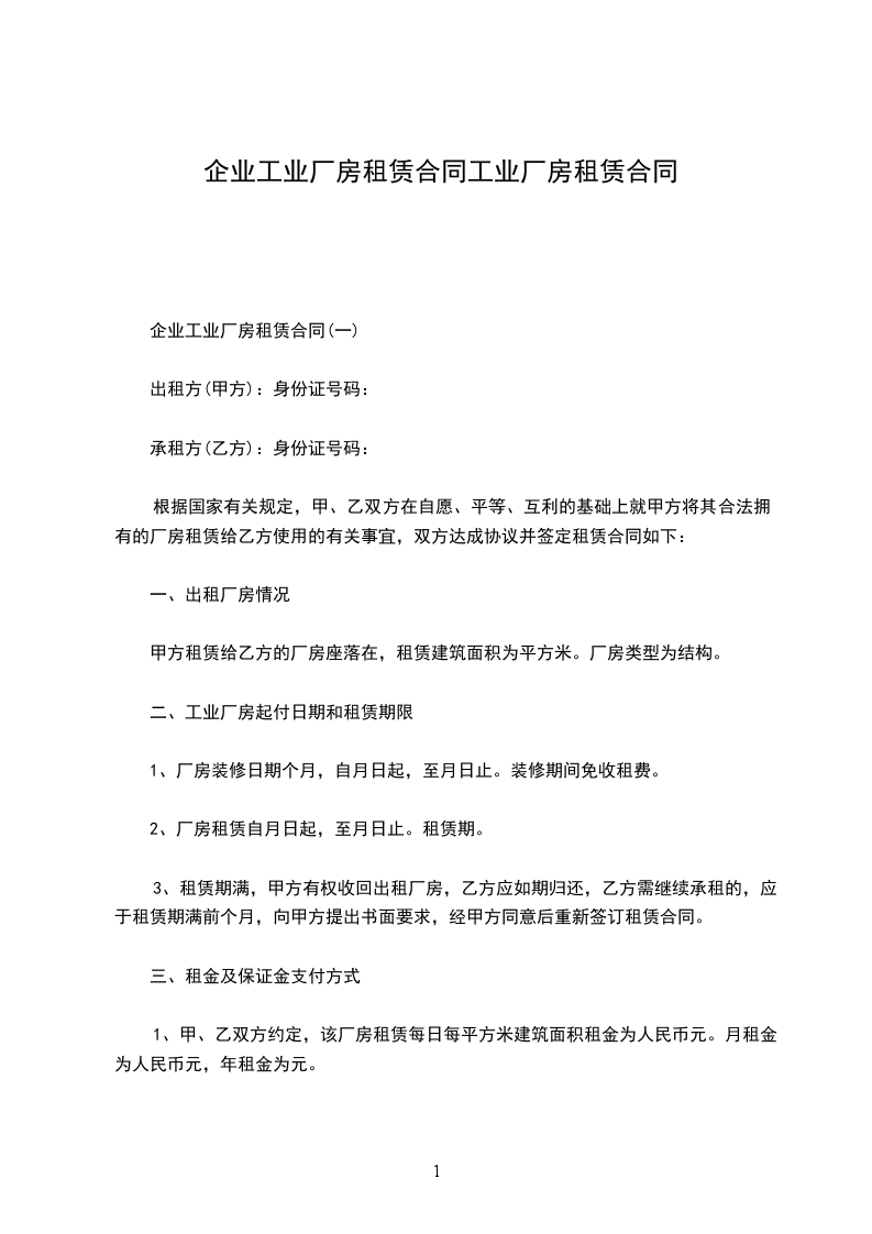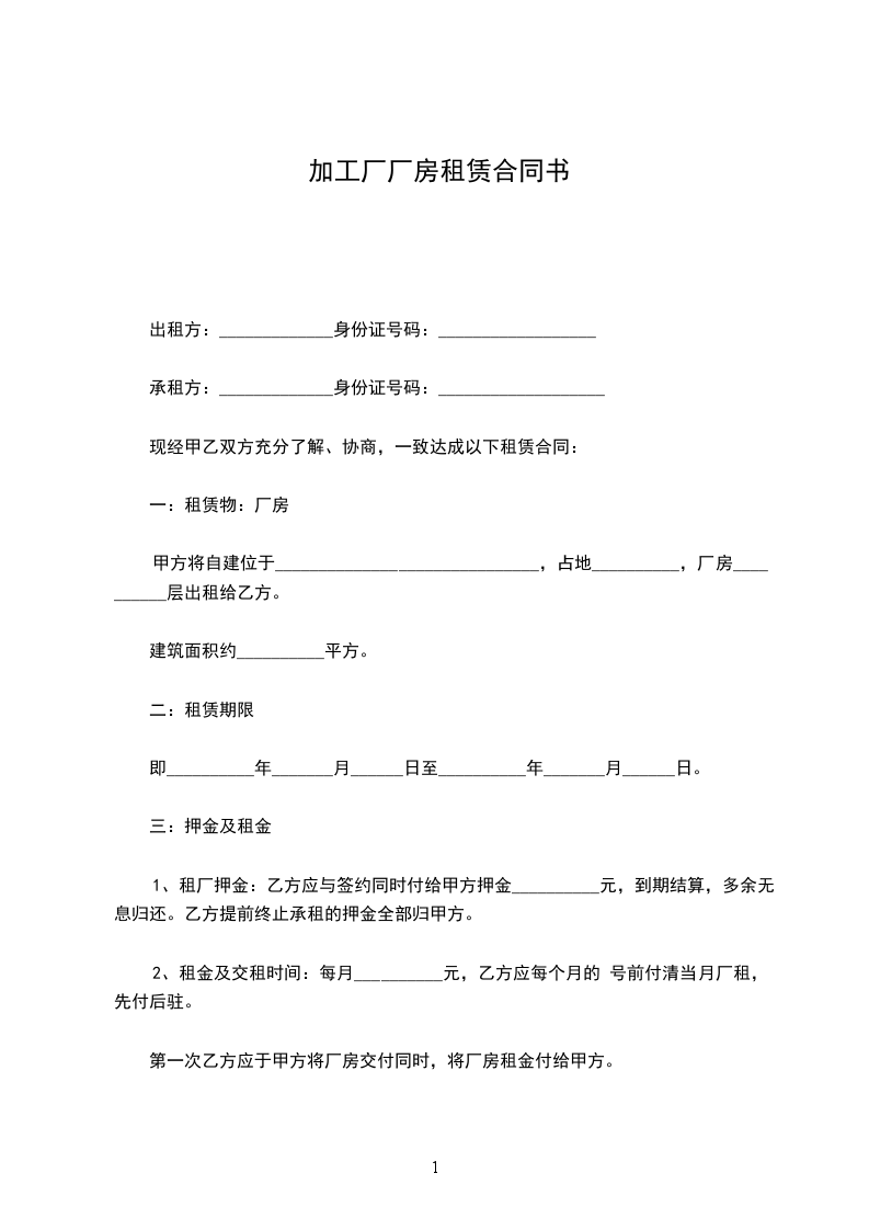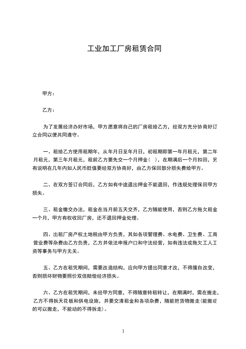 为了发展经济办好市场,甲方愿意将自己的厂房租给乙方,经双方充分协商好订立合同以便共同遵守。