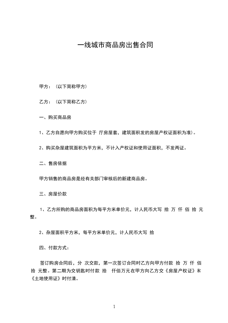 1、乙方所购的商品房面积为每平方米单价元,计人民币大写 拾 万 仟 佰 拾 元整。