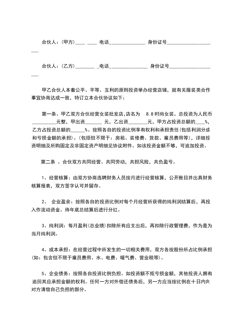 第一条、 甲乙双方合伙经营女装批发店,店名为8.8时尚女装。总投资为人民币__________元整,甲出资_______ 元,乙出资________元,甲方占投资总额的____%,乙方占投资总额的______%。按照各自的投资比例享有权利和承担责任(包括利润分成和亏损金额的承担)。(包括但不限于:房租、装修费、货款、雇员费用等),详细投资明细及所购固定及非固定资产明细见协议附件。如该投资金额不够,可追加投资。