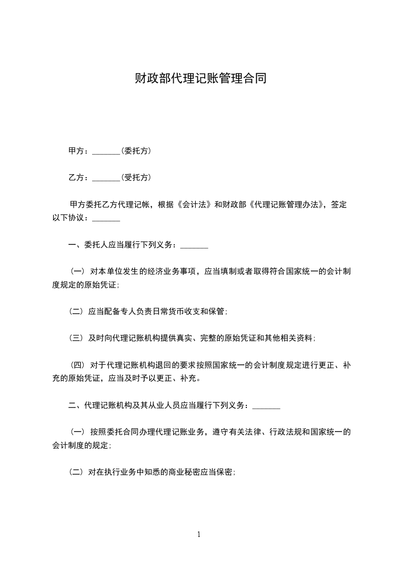 甲方委托乙方代理记帐,根据《会计法》和财政部《代理记账管理办法》,签定以下协议: