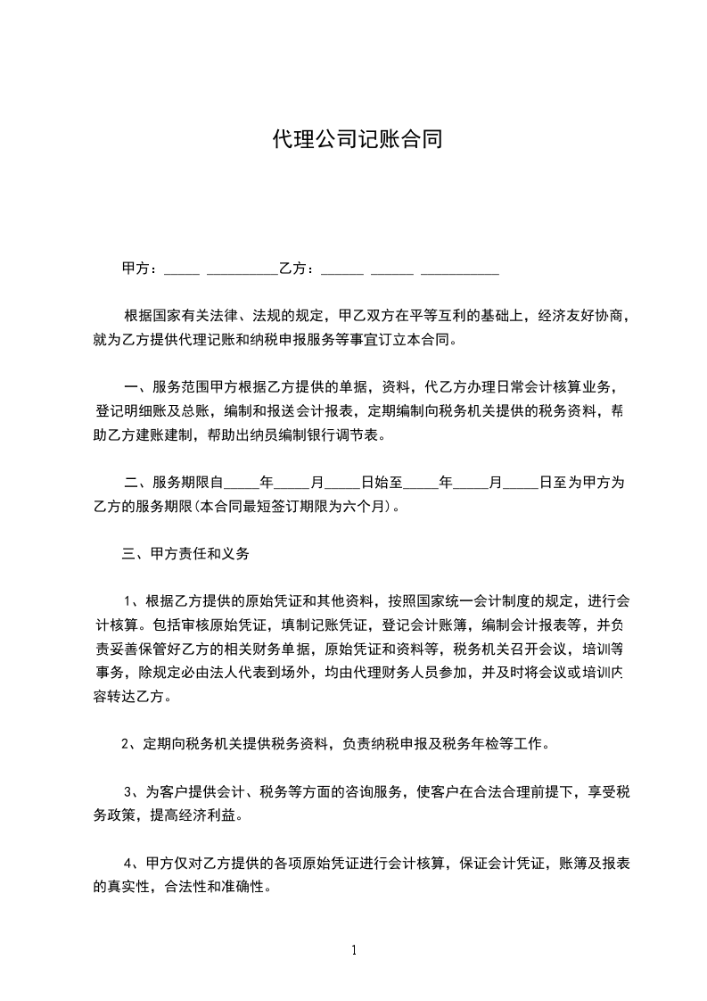 经协商,乙方代理记帐收费标准为人民币每月 元,按月支付。