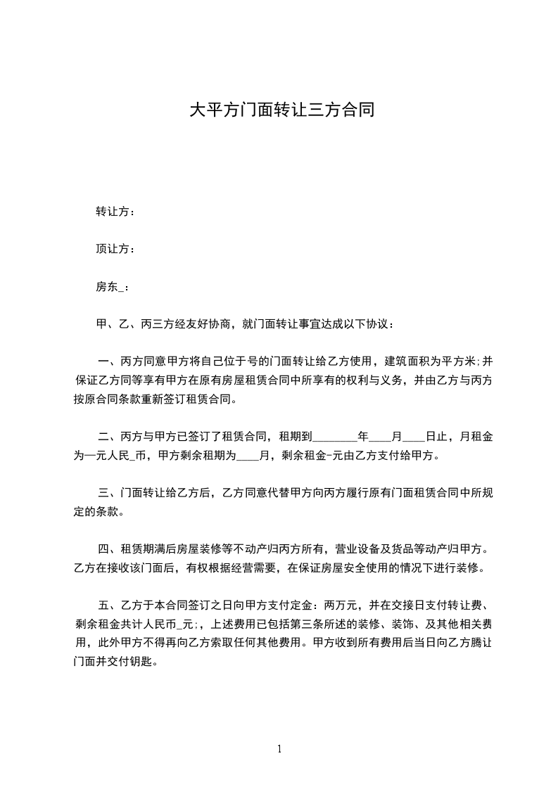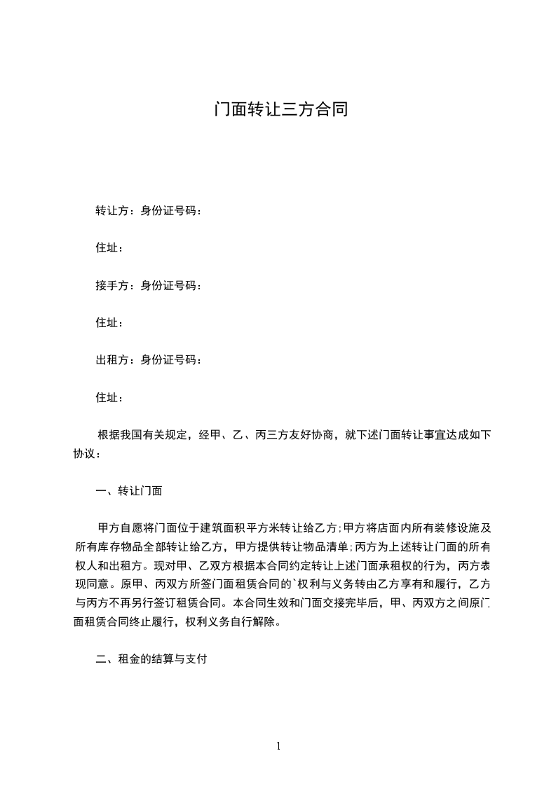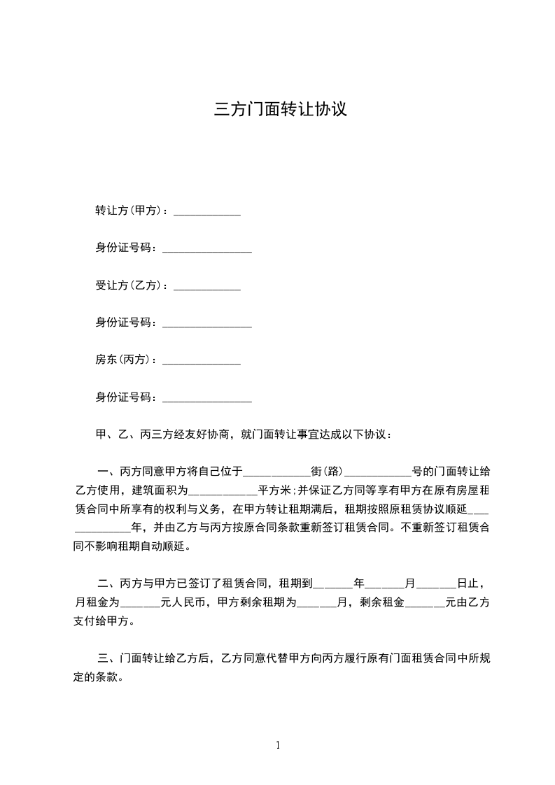 根据我国《民法典》的有关规定,经甲、乙、丙三方友好协商,就下述门面转让事宜达成如下协议: