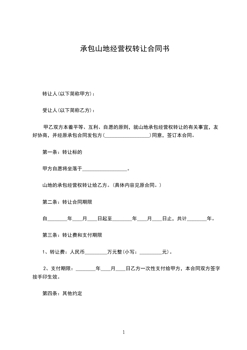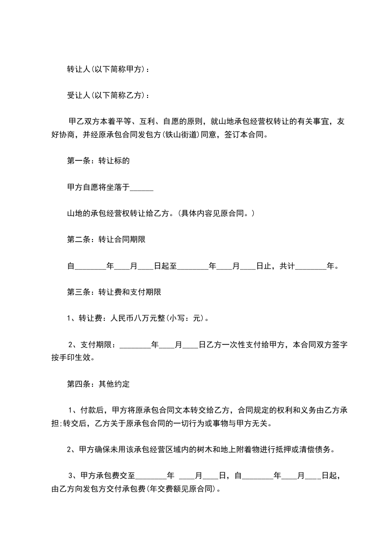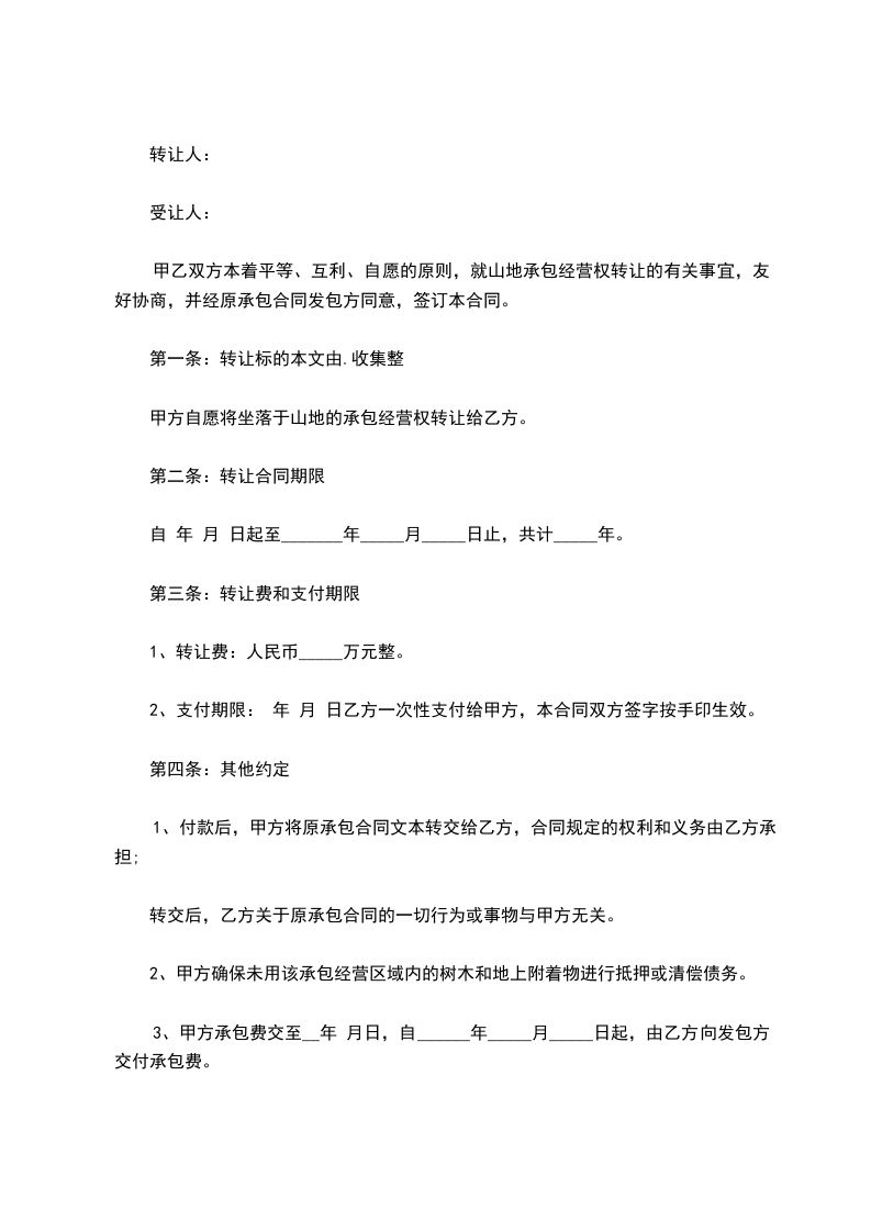甲乙双方本着平等、互利、自愿的原则,就山地承包经营权转让的有关事宜,友好协商,并经原承包合同发包方(__________________)同意,签订本合同。