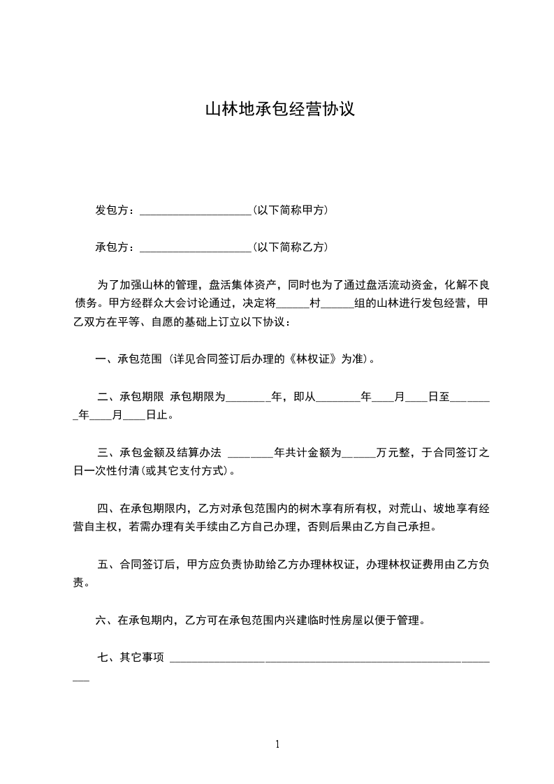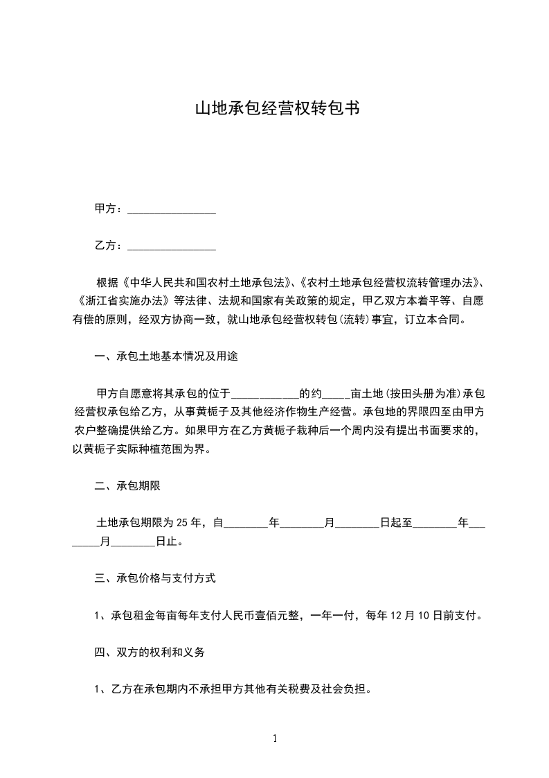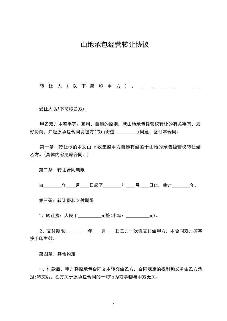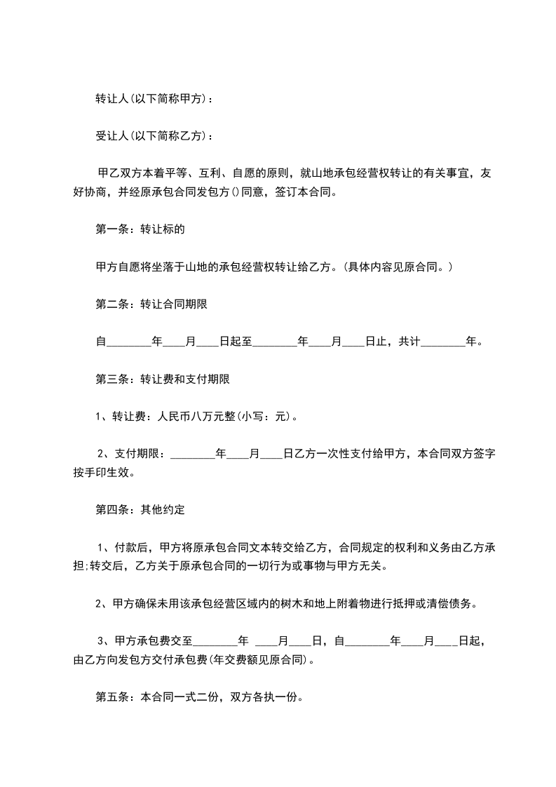 甲乙双方本着平等、互利、自愿的原则,就山地承包经营权转让的有关事宜,友好协商,并经原承包合同发包方(__________________)同意,签订本合同。