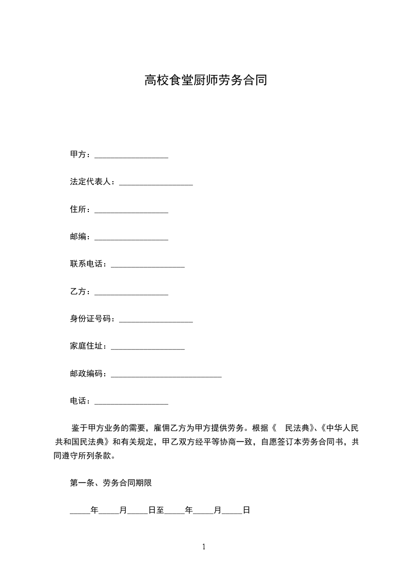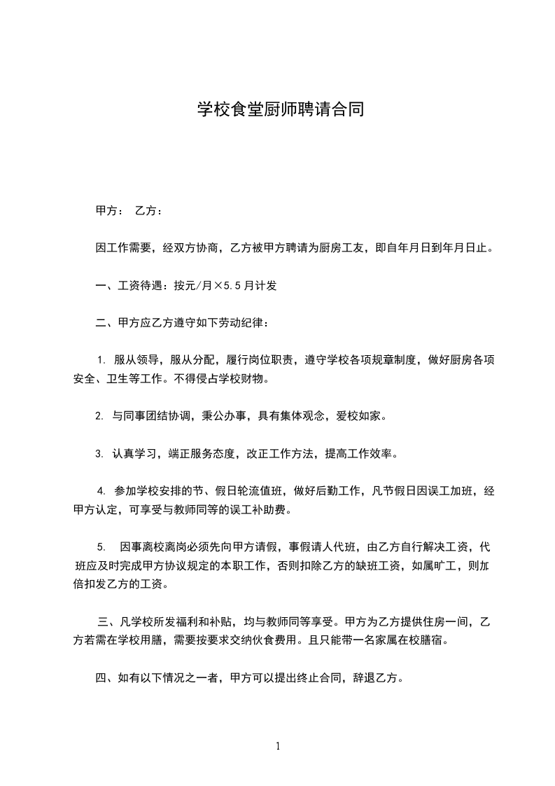 因工作需要,经双方协商,乙方被甲方聘请为厨房工友,即自_____年_____月_____日到_____年_____月_____日止。