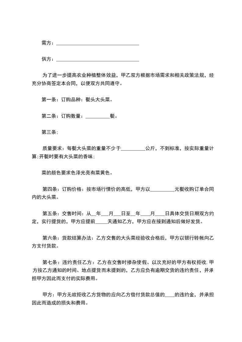 第四条:订购价格:按市场行情价的高低,甲方以__________元甏收购订单合同内的大头菜。