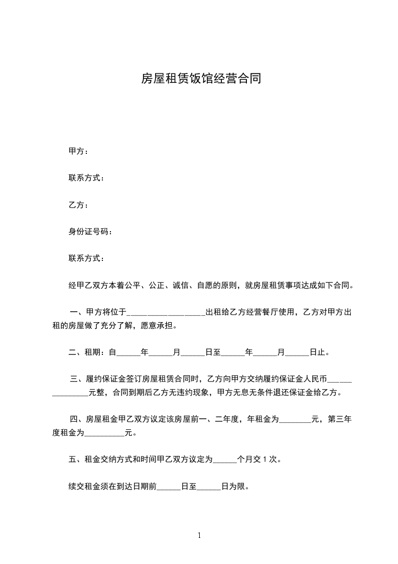 一、甲方将位于___________________出租给乙方经营餐厅使用,乙方对甲方出租的房屋做了充分了解,愿意承担。