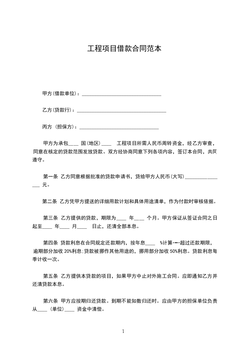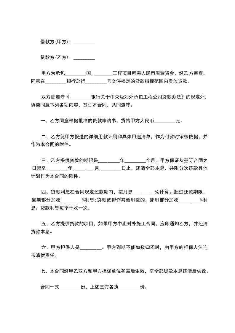 甲方为承包_________国_________工程项目所需人民币周转资金,经乙方审查,同意在_________银行总行_________号文件核定的贷款指标范围内发放贷款。