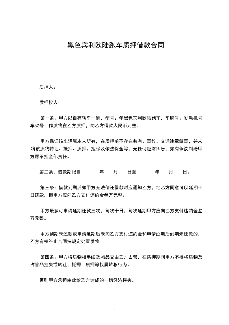 第一条:甲方以自有轿车一辆,型号:年黑色宾利欧陆跑车,车牌号:发动机号车架号:作质物在乙方质押,向乙方借款人民币_____元整。