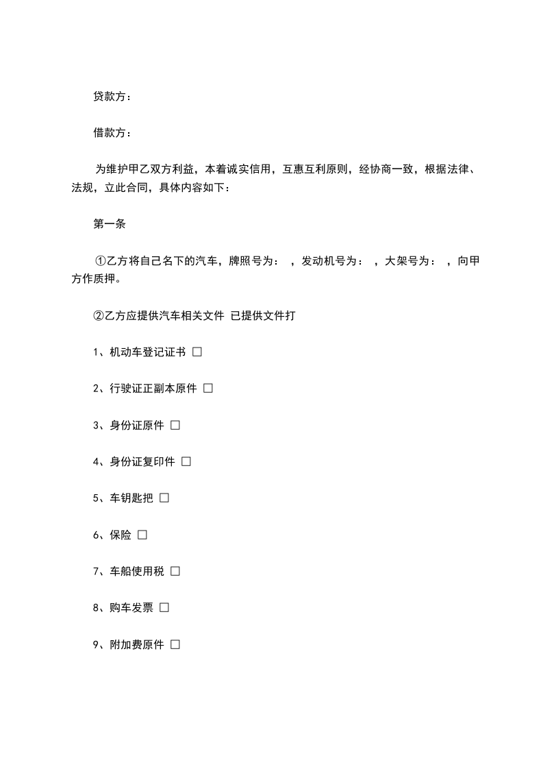 ①乙方将自己名下的汽车,牌照号为: ,发动机号为: ,大架号为: ,向甲方作质押。