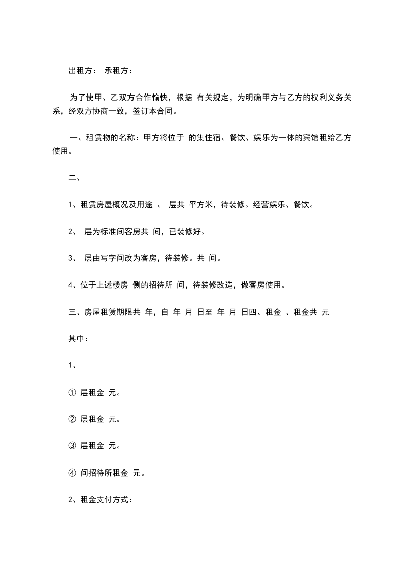 一、租赁物的名称:甲方将位于 的集住宿、餐饮、娱乐为一体的宾馆租给乙方使用。