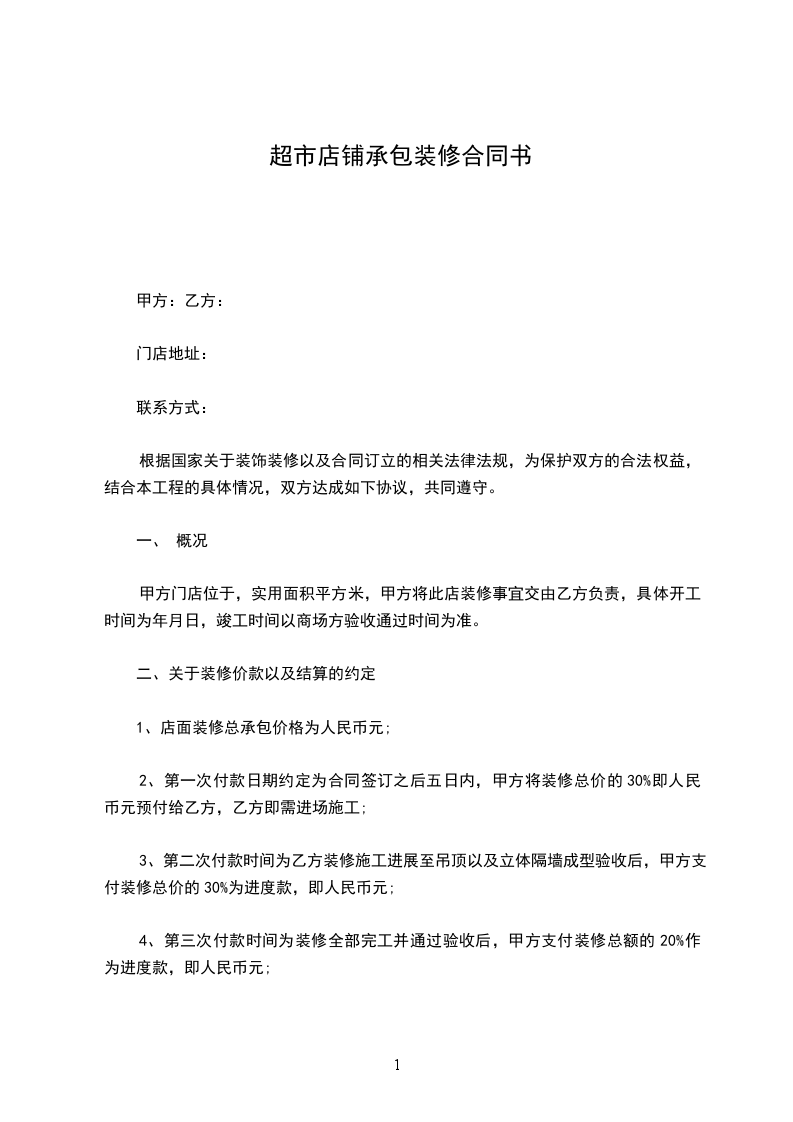 1、店面装修总承包价格为人民币_____元;