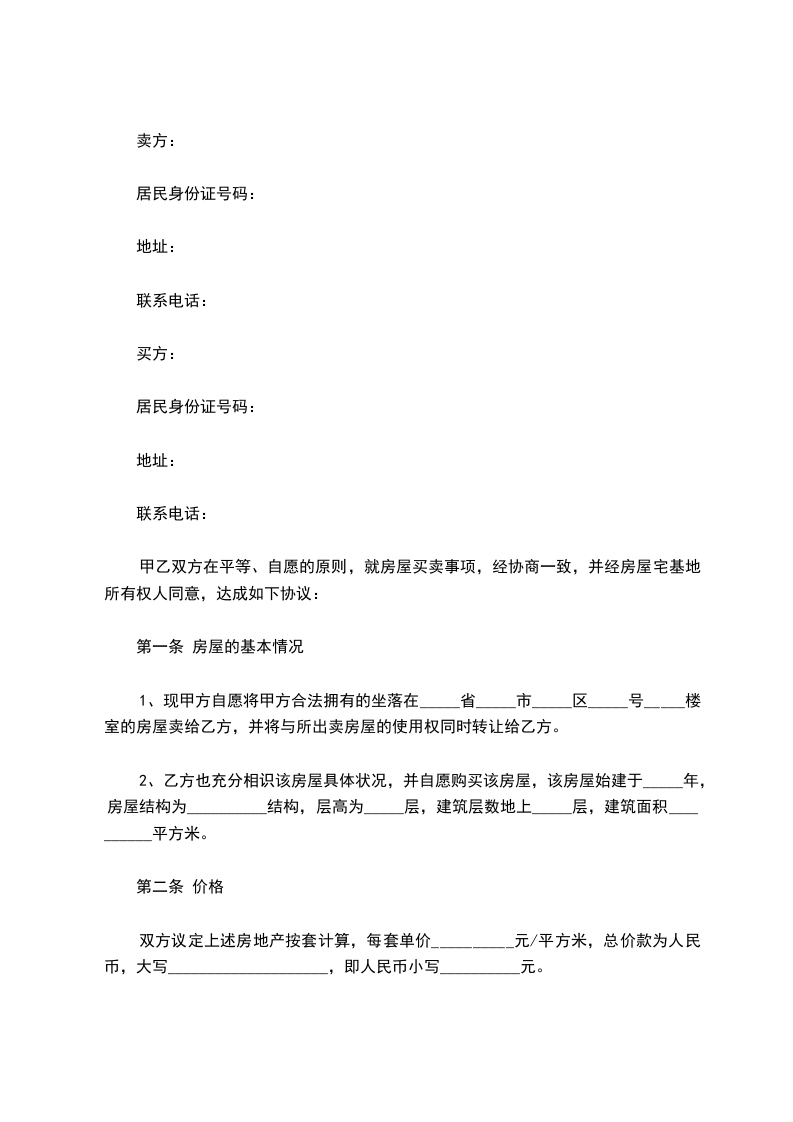 1、现甲方自愿将甲方合法拥有的坐落在_____省_____市_____区_____号_____楼室的房屋卖给乙方,并将与所出卖房屋的使用权同时转让给乙方。