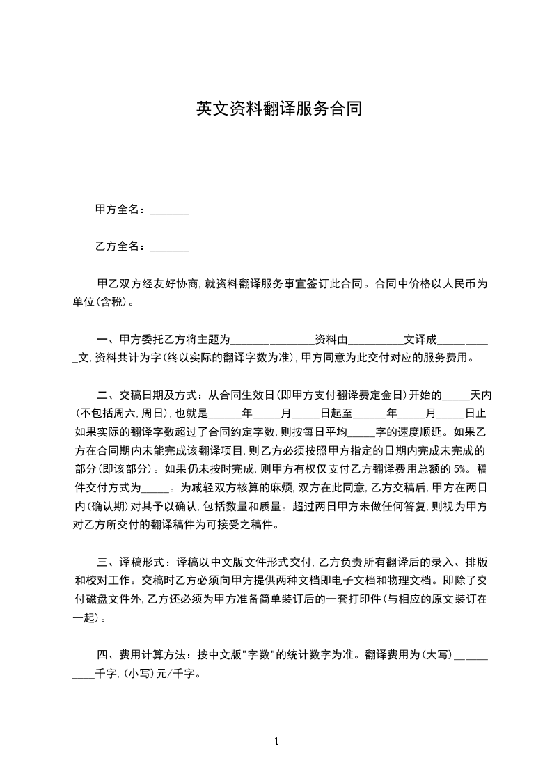 五、乙方按优惠价格向甲方收取翻译费用:英译汉为_________元/千字符。