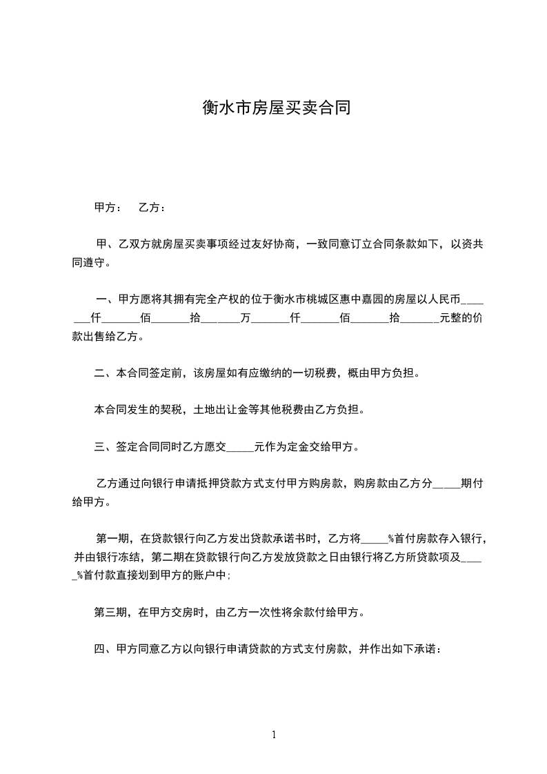 一、甲方愿将其拥有完全产权的位于衡水市桃城区惠中嘉园的房屋以人民币_______仟_______佰_______拾_______万_______仟_______佰_______拾_______元整的价款出售给乙方。