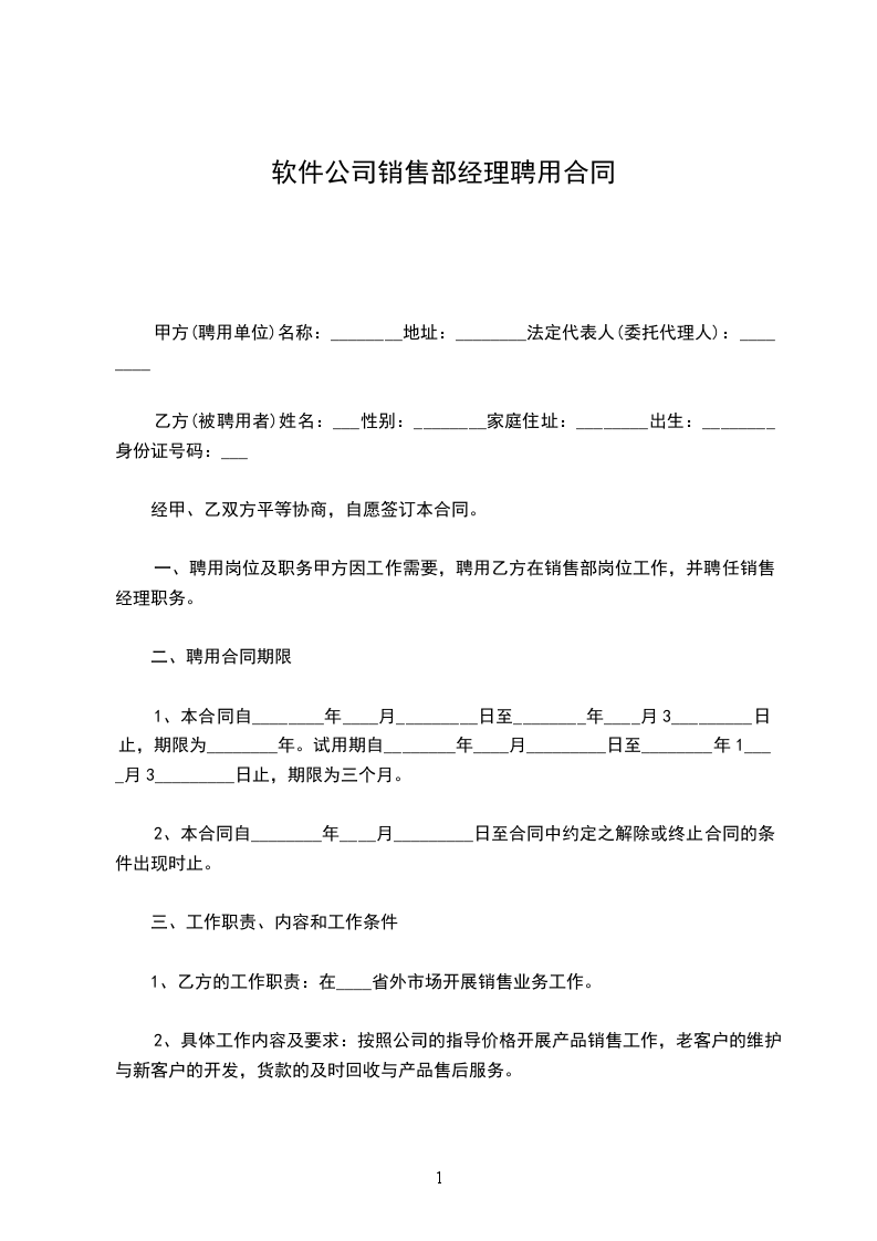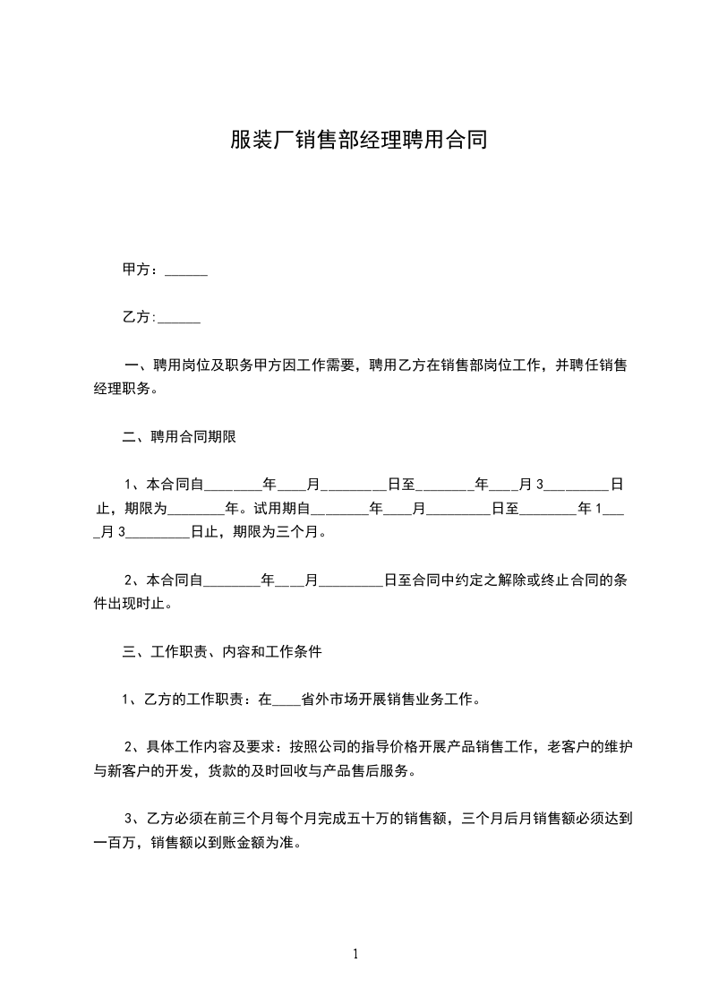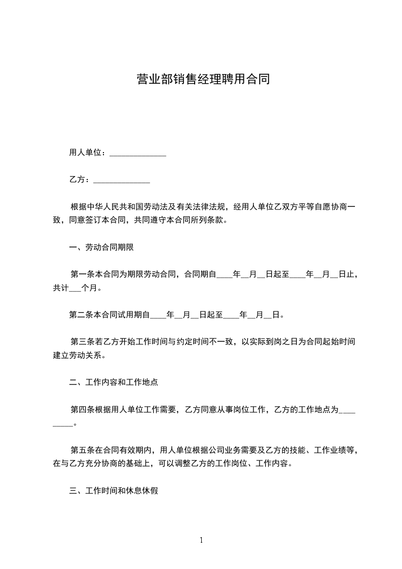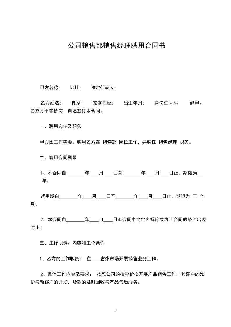 甲方因工作需要,聘用乙方在 销售部 岗位工作,并聘任 销售经理 职务。