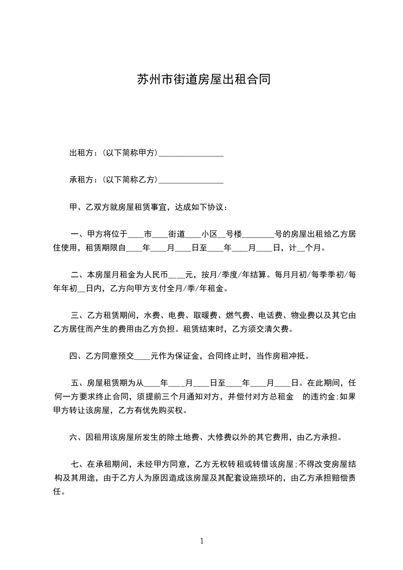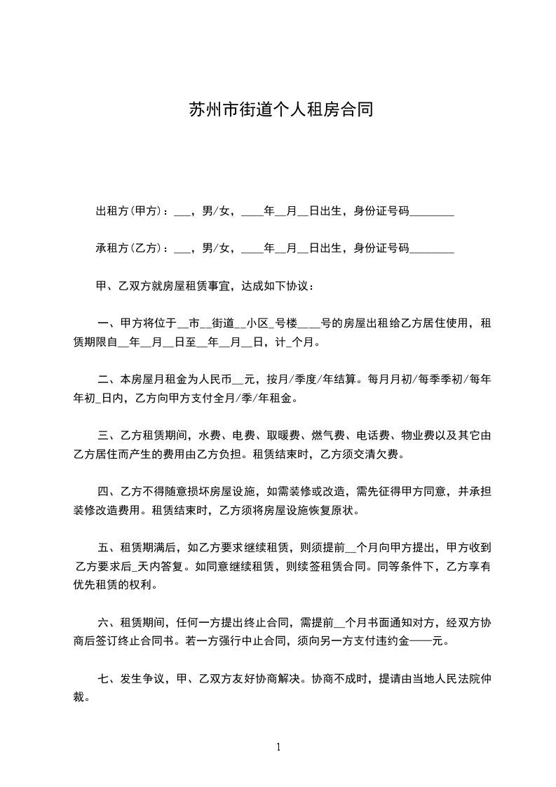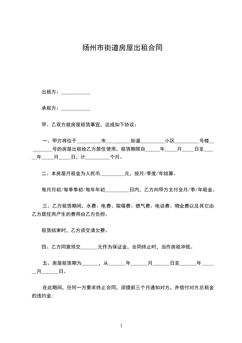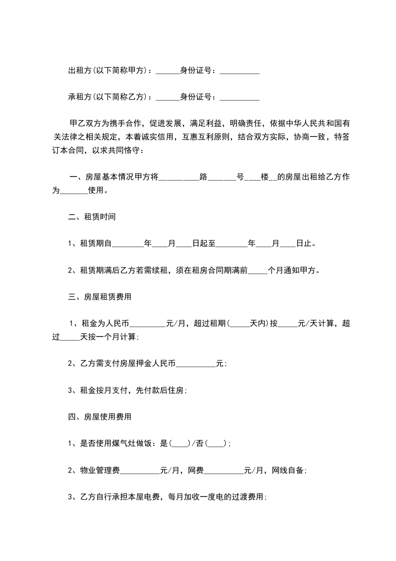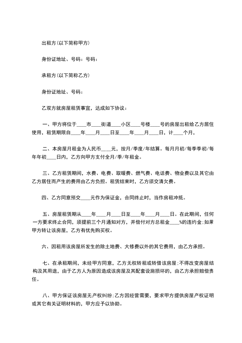 一、甲方将位于__市__街道__小区_号楼____号的房屋出租给乙方居住使用,租赁期限自__年__月__日至__年__月__日,计_个月。