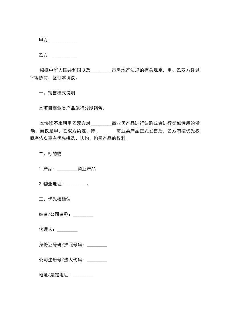 本协议不表明甲乙双方对_________商业类产品进行认购或者进行类似性质的活动,而仅是甲、乙双方约定,待_________商业类产品正式发售后,乙方有按优先权顺序依次享有优先挑选、认购、购买产品的权利。