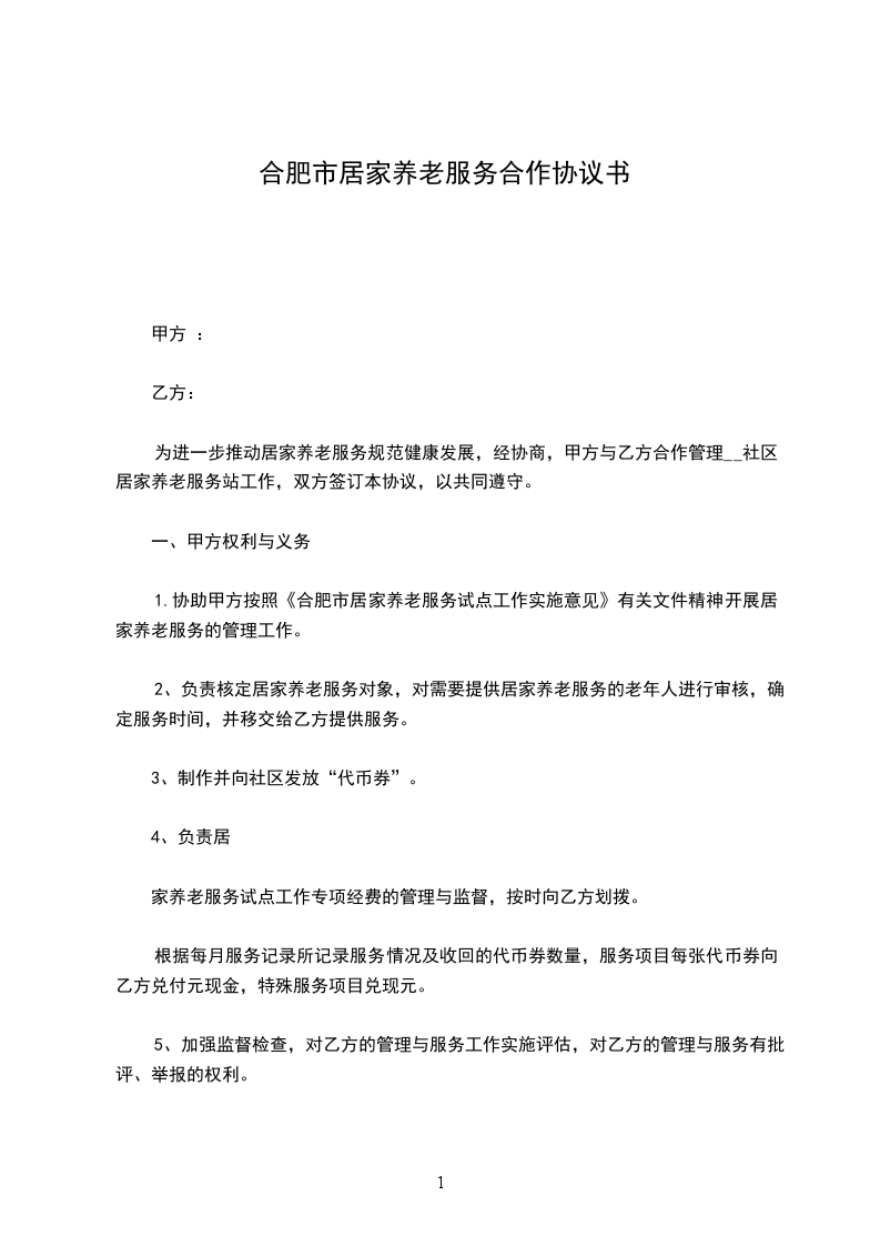 1.协助甲方按照《合肥市居家养老服务试点工作实施意见》有关文件精神开展居家养老服务的管理工作。