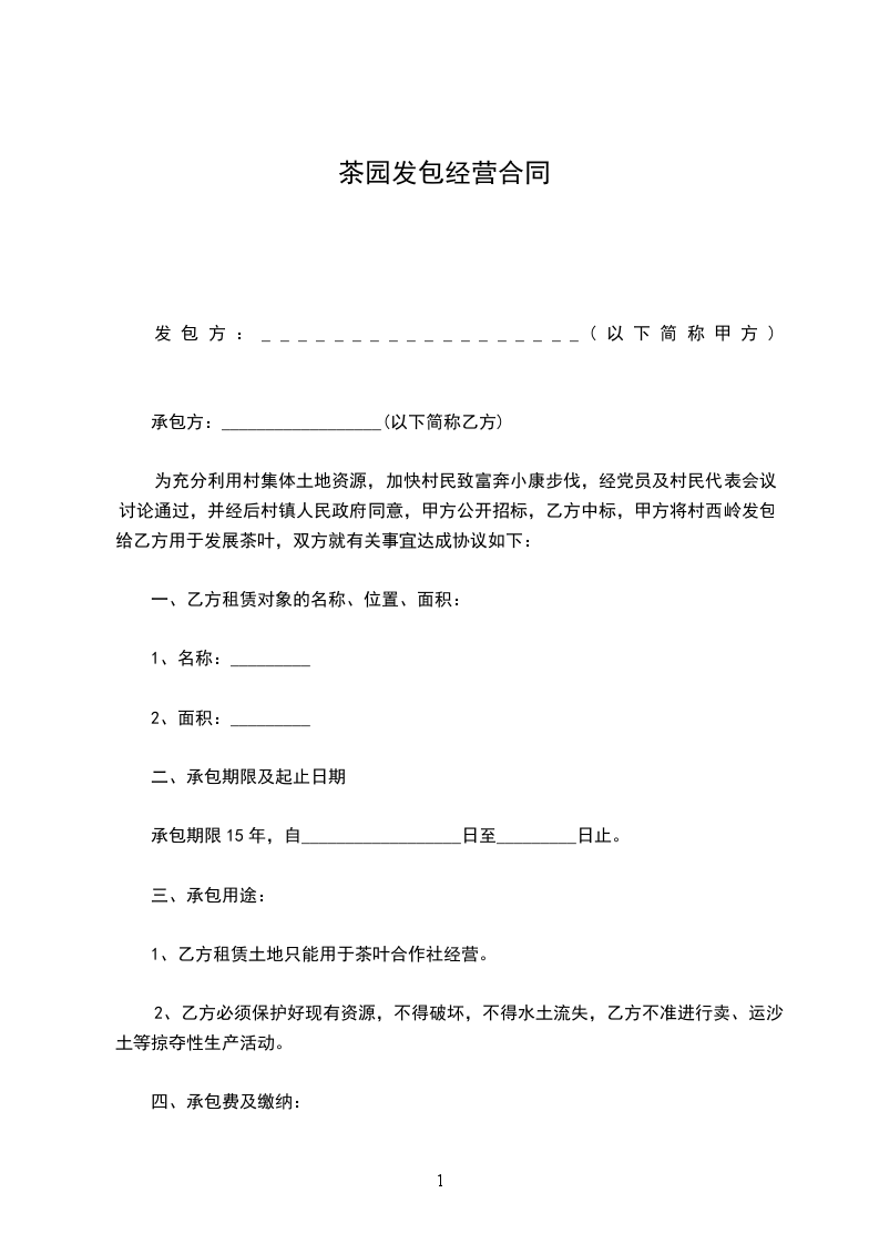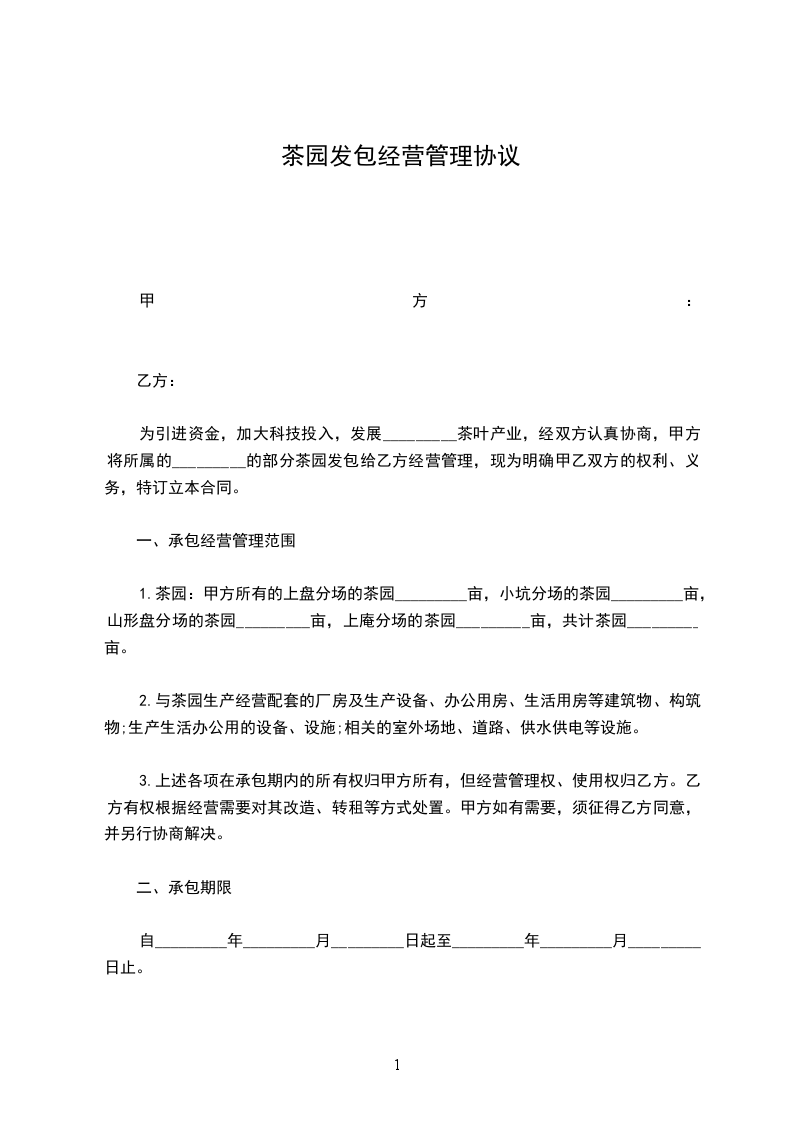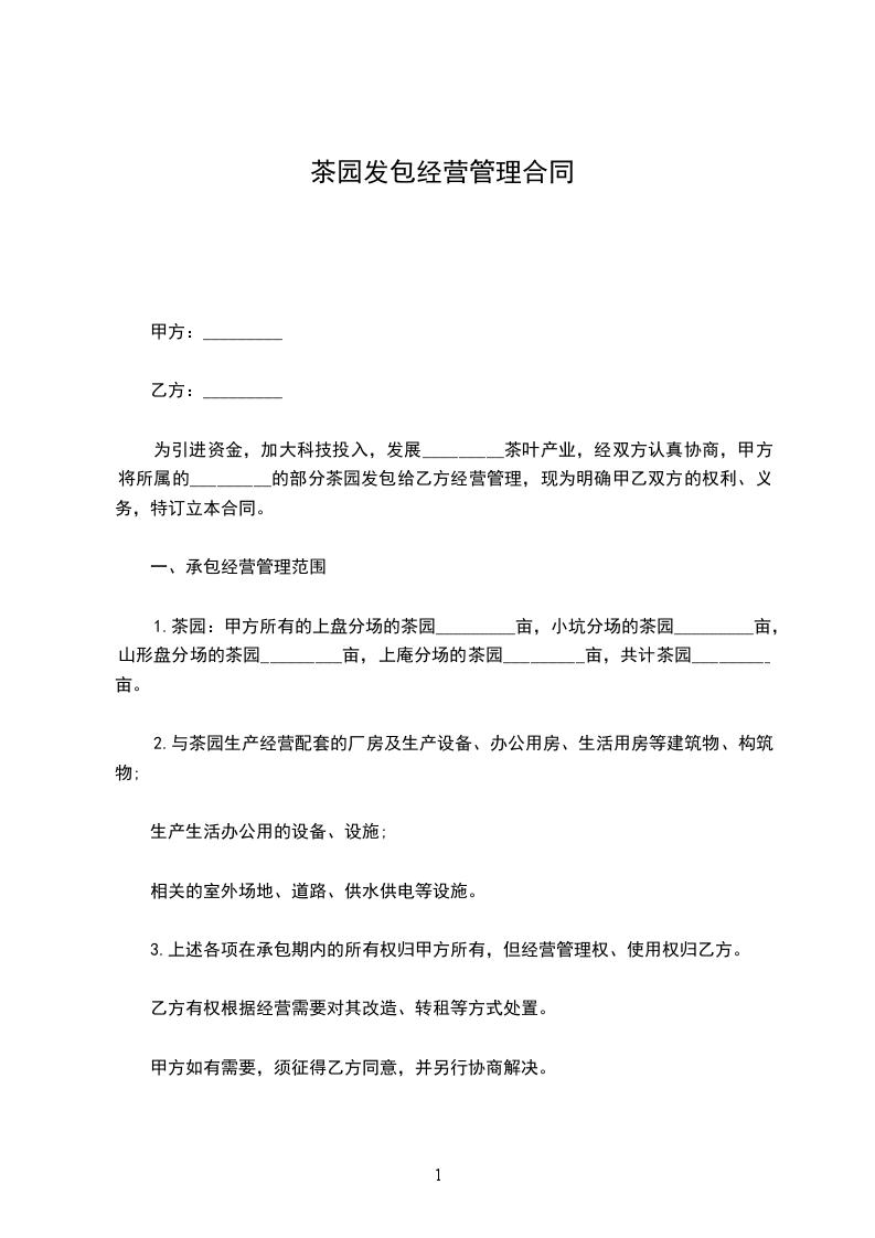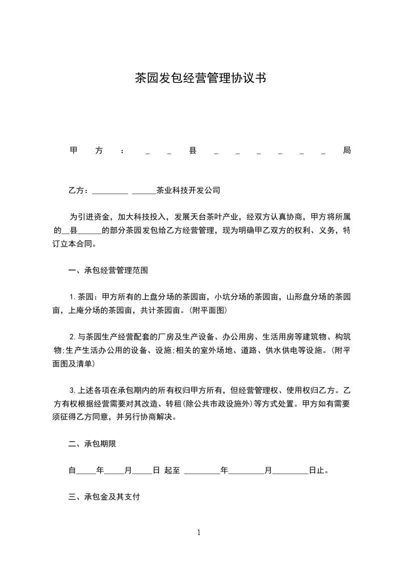 为引进资金,加大科技投入,发展天台茶叶产业,经双方认真协商,甲方将所属的__县___的部分茶园发包给乙方经营管理,现为明确甲乙双方的权利、义务,特订立本合同。