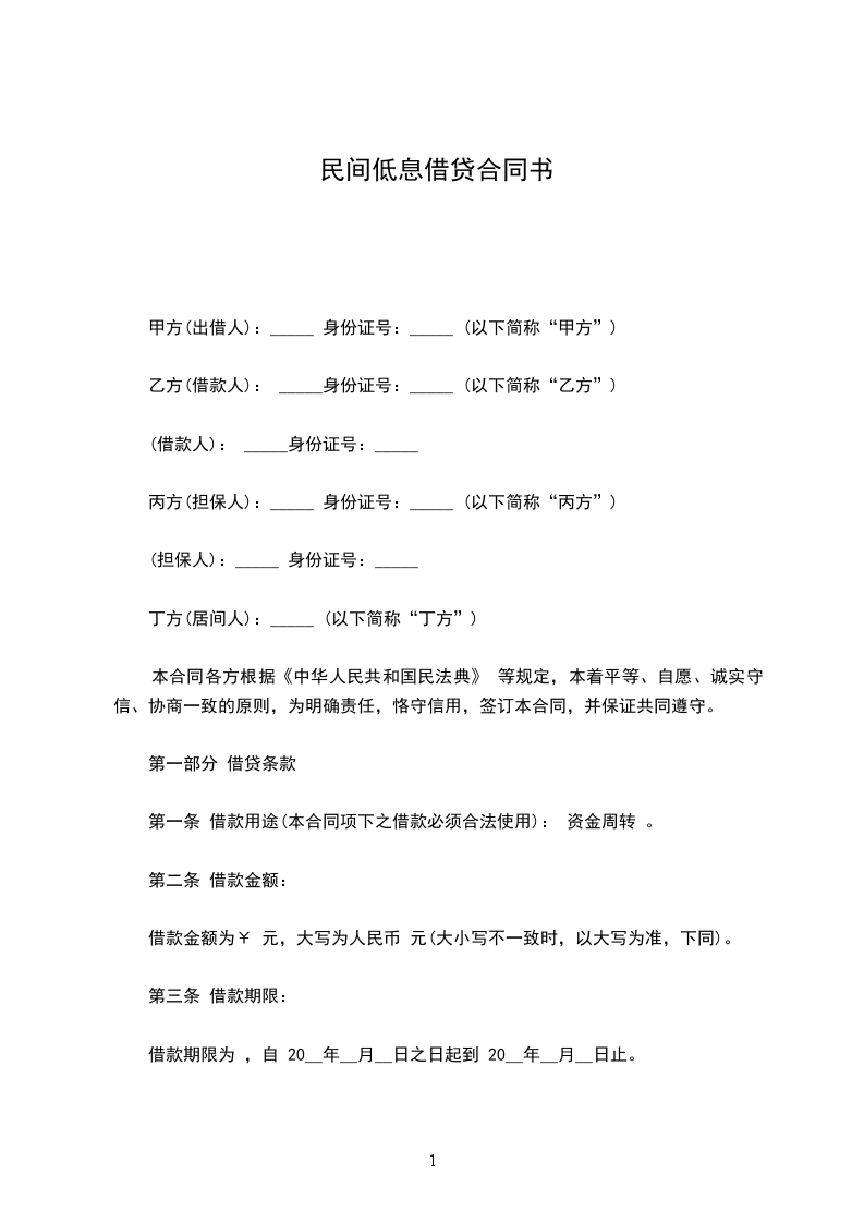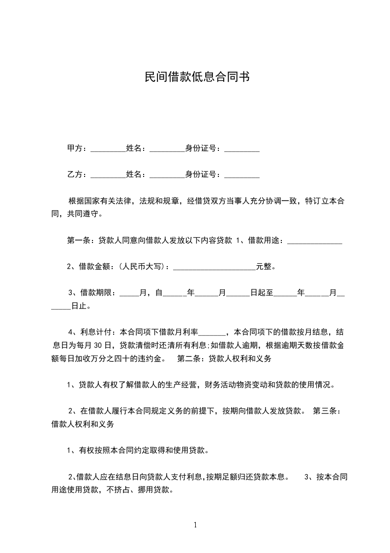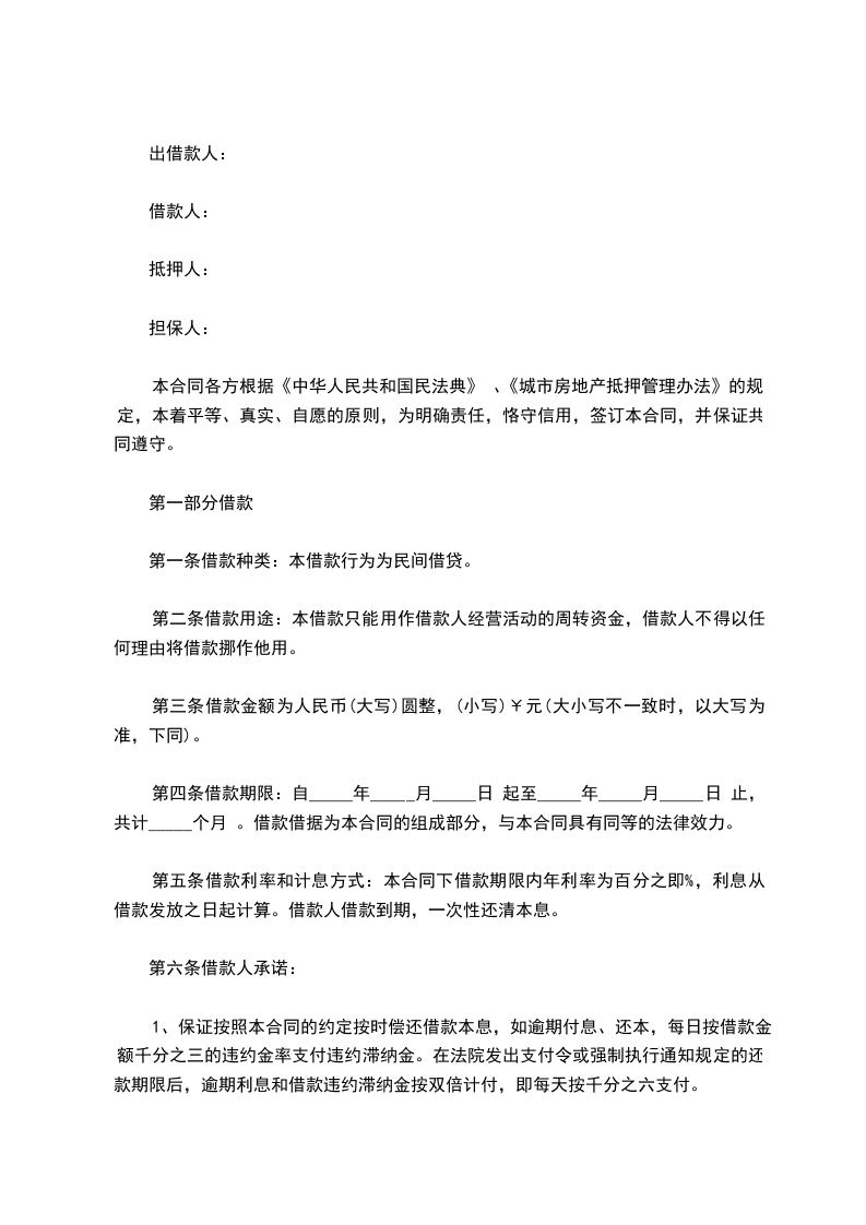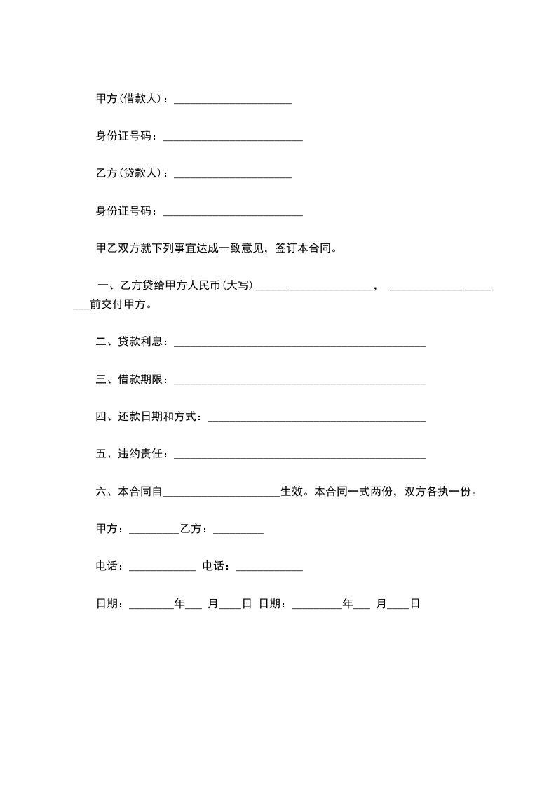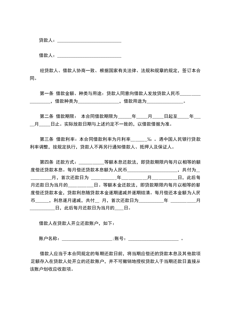 第一条 借款金额、种类与用途:贷款人同意向借款人发放贷款人民币__________________,借款种类为__________________,借款用途为________________。