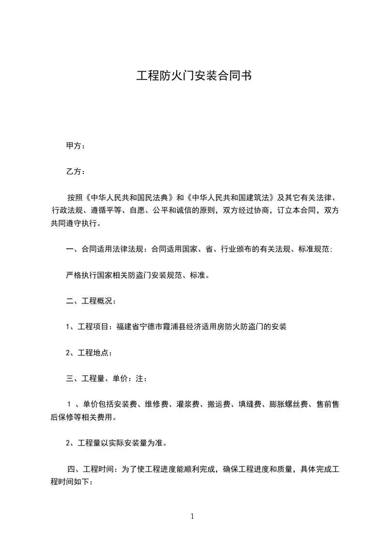 1、工程项目:福建省宁德市霞浦县经济适用房防火防盗门的安装